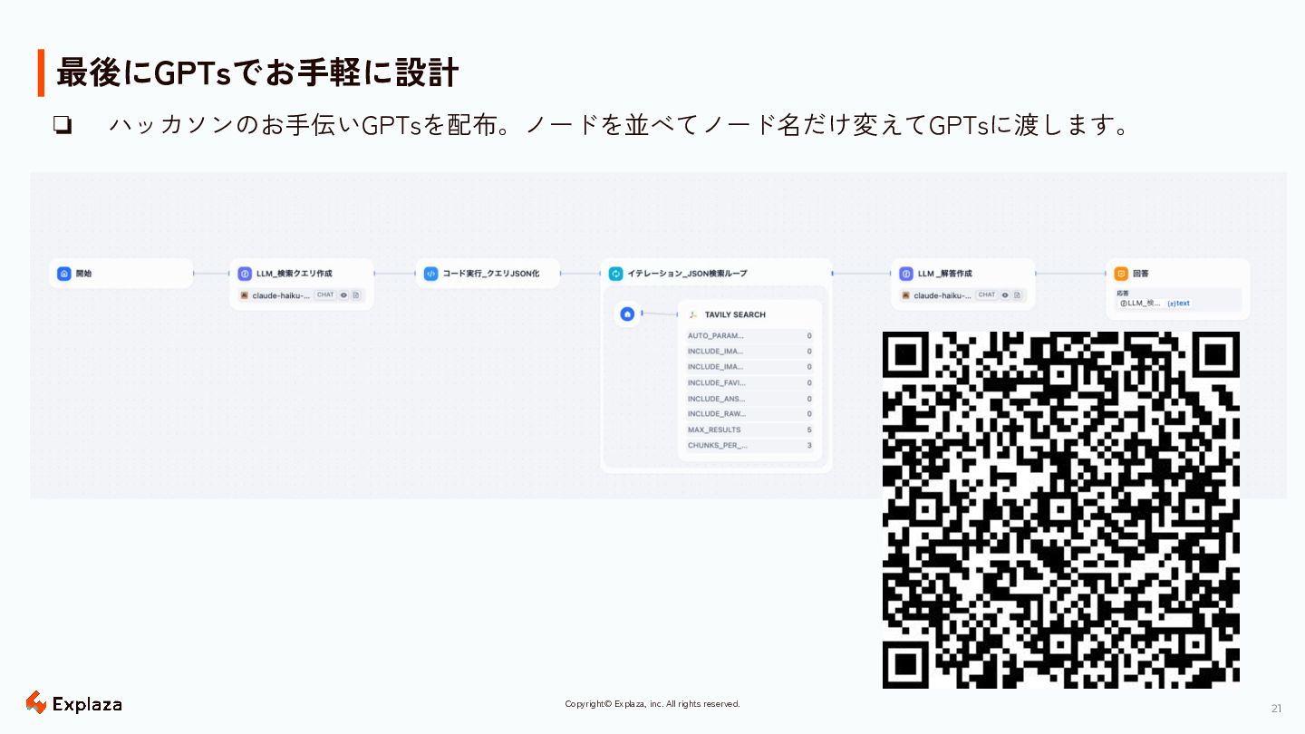 21 Copyright© Explaza, inc. All rights reserved. 最後にGPTsでお手軽に設計 ❏ ハッカソンのお手伝いGPTsを配布。ノードを並べてノード名だけ変えてGPTsに渡します。