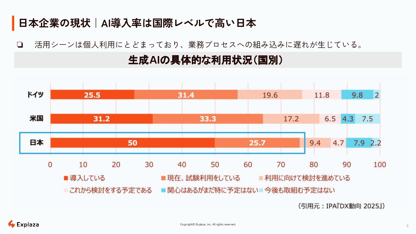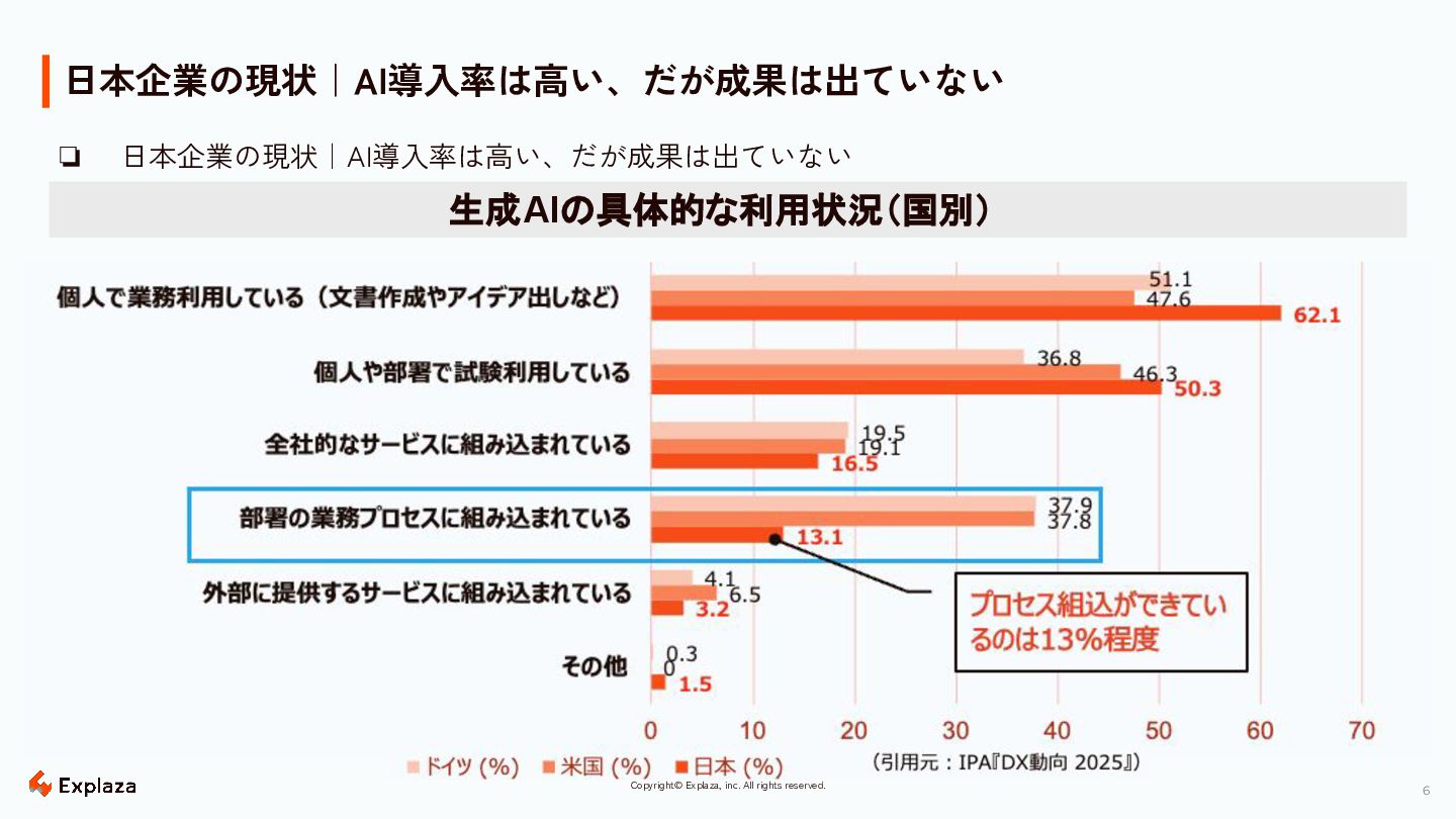 5 Copyright© Explaza, inc. All rights reserved. 日本企業の現状|AI導入率は国際レベルで高い日本 ❏ 活用シーンは個人利用にとどまっており、業務プロセスへの組み込みに遅れが生じている。