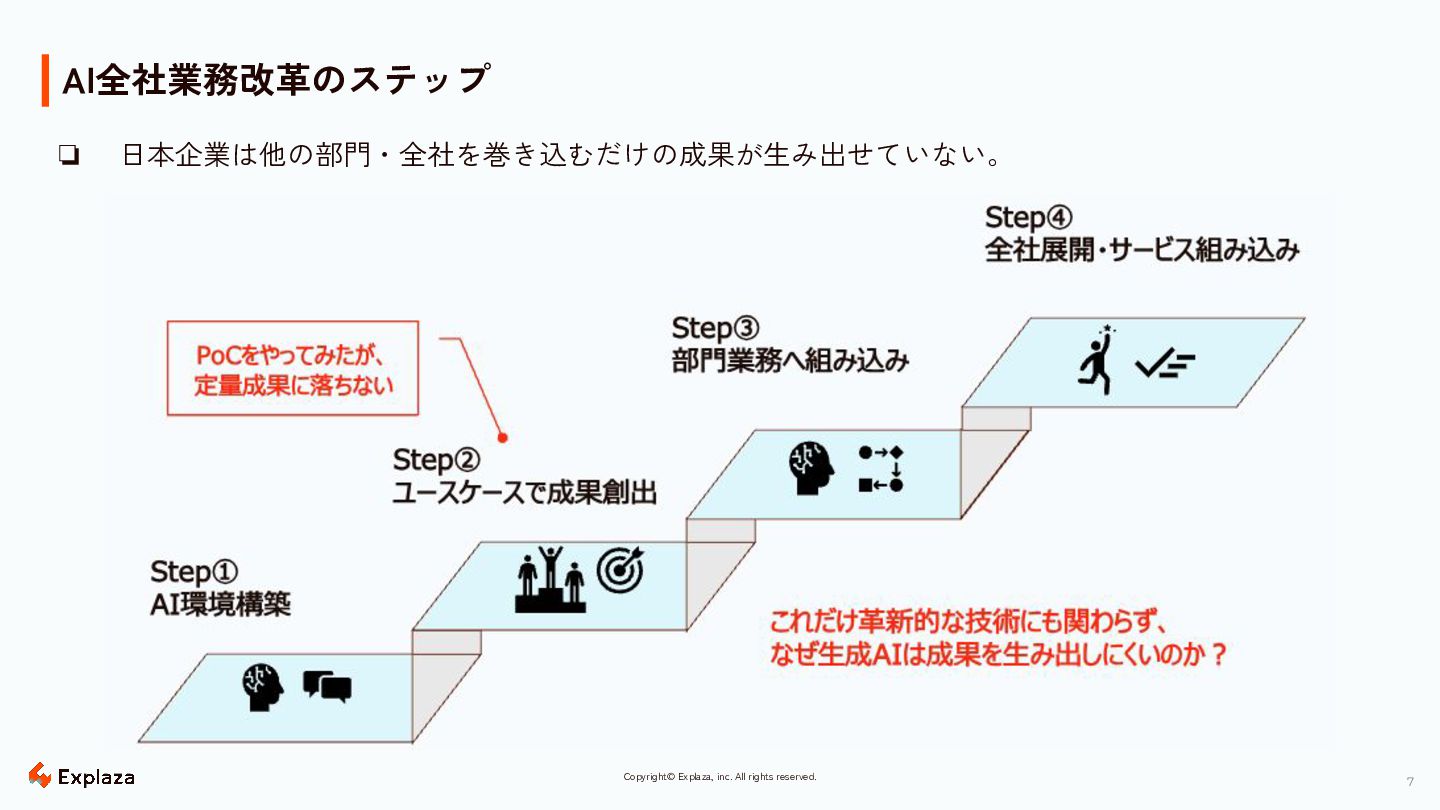 6 Copyright© Explaza, inc. All rights reserved. 日本企業の現状|AI導入率は高い、だが成果は出ていない ❏ 日本企業の現状|AI導入率は高い、だが成果は出ていない