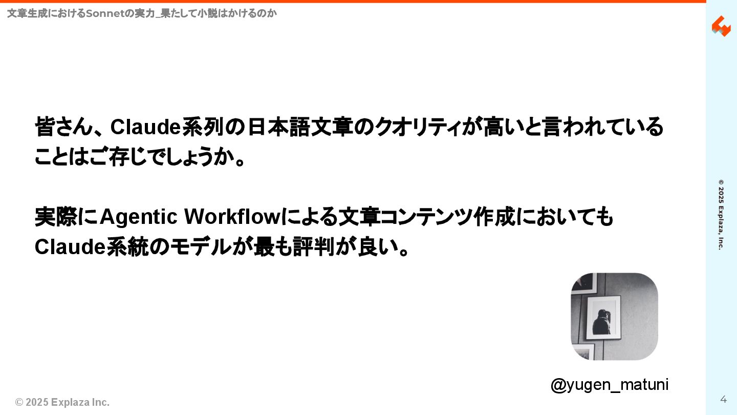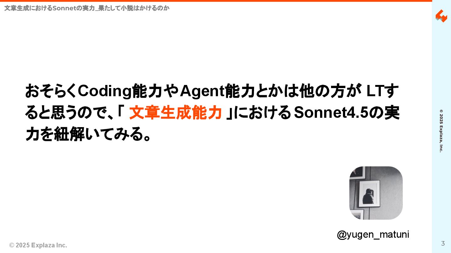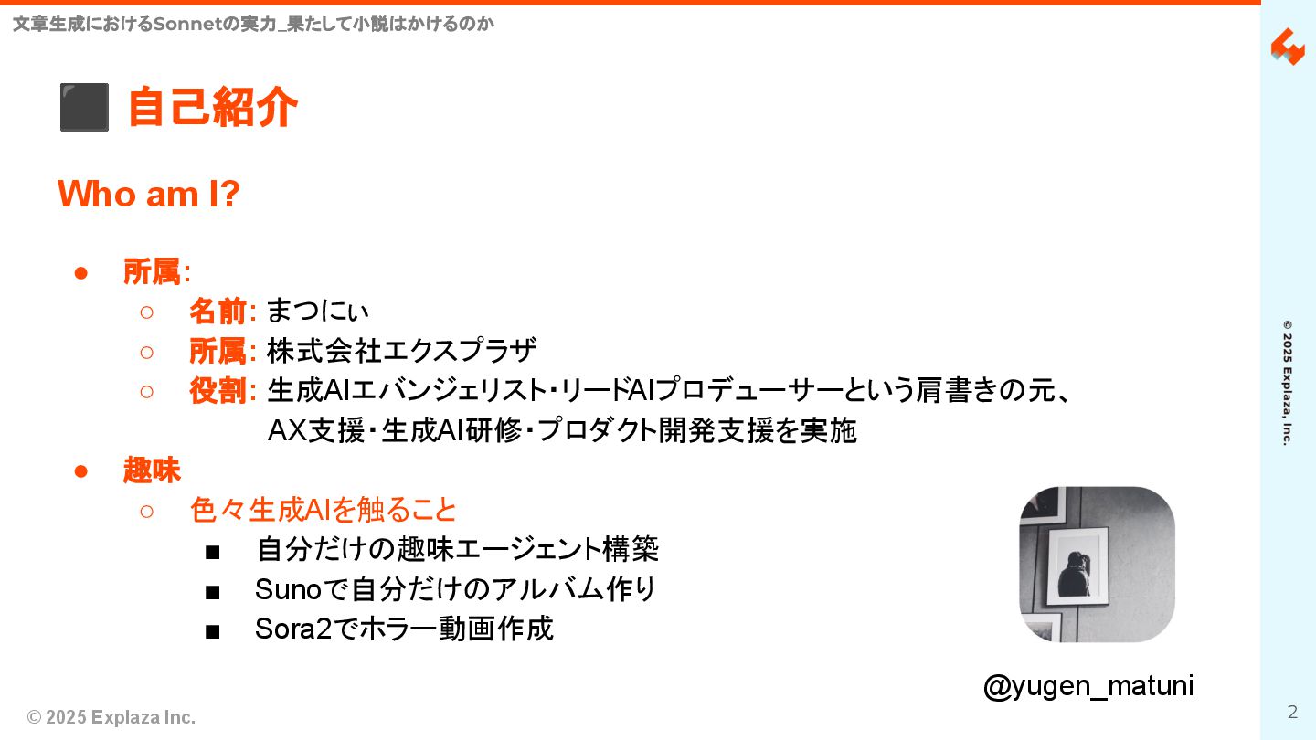 ◦ 所属: 株式会社エクスプラザ ◦ 役割: 生成AIエバンジェリスト・リードAIプロデューサーという肩書きの元、 AX支援・生成AI研修・プロダクト開発支援を実施 • 趣味 ◦ 色々生成AIを触ること ▪ 自分だけの趣味エージェント構築 ▪ Sunoで自分だけのアルバム作り ▪ Sora2でホラー動画作成 © 2025 Explaza Inc. 2 文章生成におけるSonnetの実力_果たして小説はかけるのか @yugen_matuni