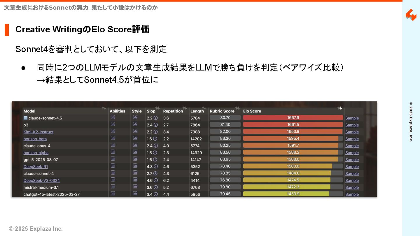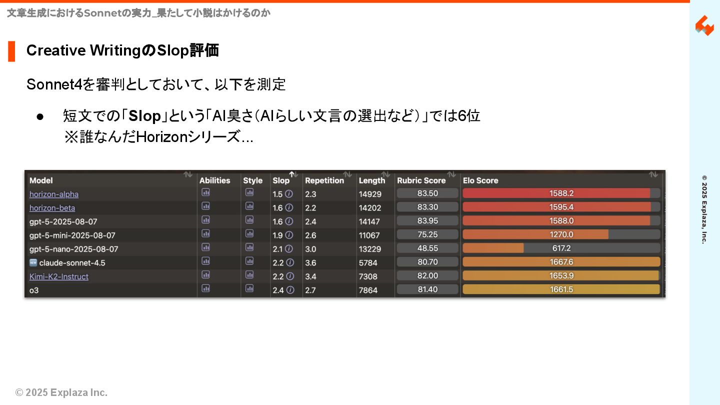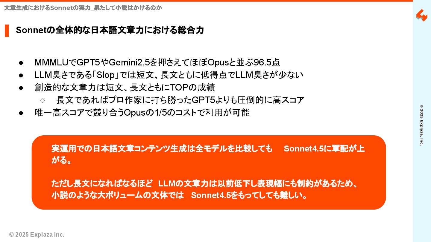 おそらくCoding能力やAgent能力とかは他の方が LTす ると思うので、「 文章生成能力 」における Sonnet4.5の実 力を紐解いてみる。 © 2025 Explaza