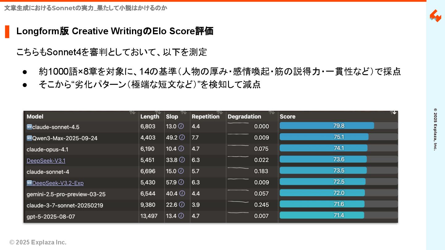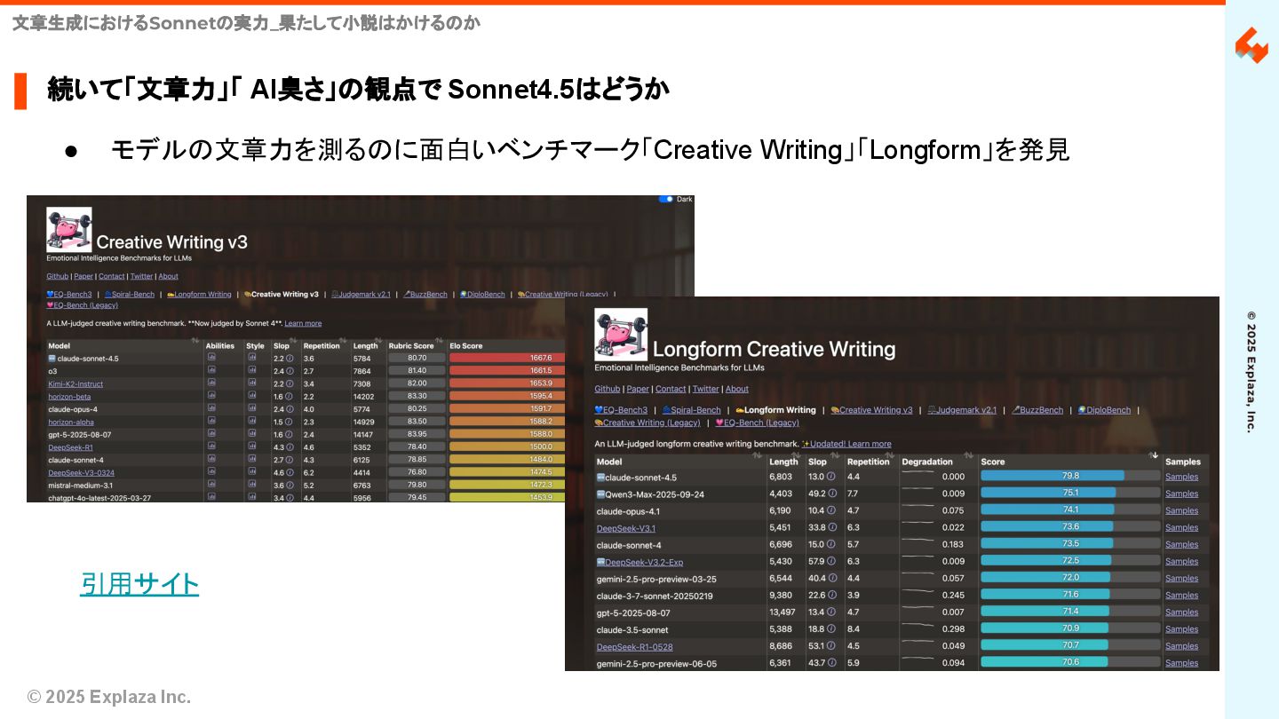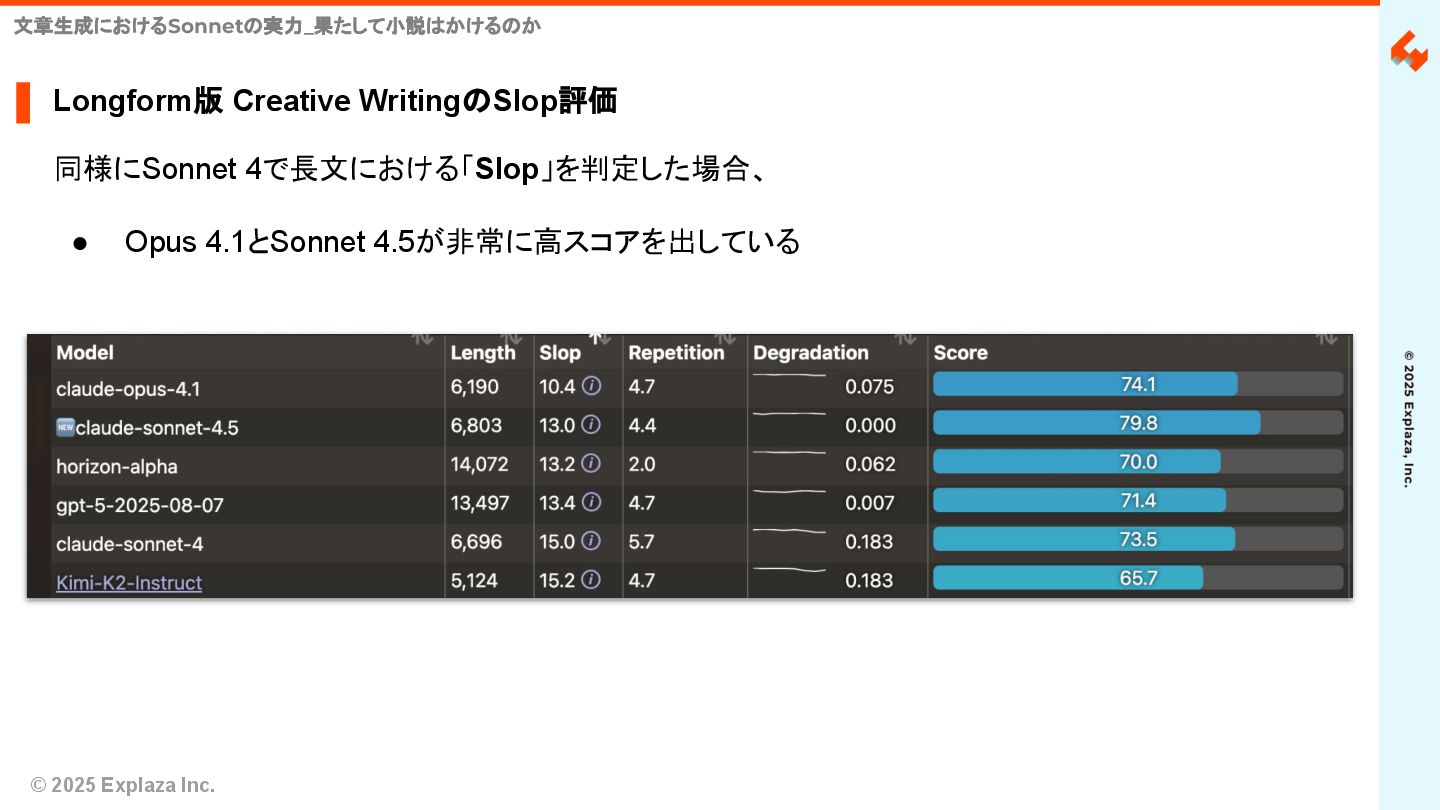 おそらくCoding能力やAgent能力とかは他の方が LTす ると思うので、「 文章生成能力 」における Sonnet4.5の実 力を紐解いてみる。 © 2025 Explaza