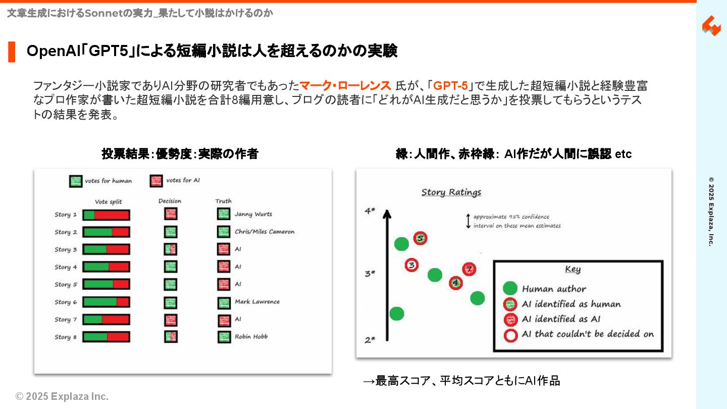 OpenAI「GPT5」による短編小説は人を超えるのかの実験 © 2025 Explaza Inc. 文章生成におけるSonnetの実力_果たして小説はかけるのか ファンタジー小説家でありAI分野の研究者でもあったマーク・ローレンス 氏が、「GPT-5」で生成した超短編小説と経験豊富 なプロ作家が書いた超短編小説を合計8編用意し、ブログの読者に「どれがAI生成だと思うか」を投票してもらうというテス トの結果を発表。