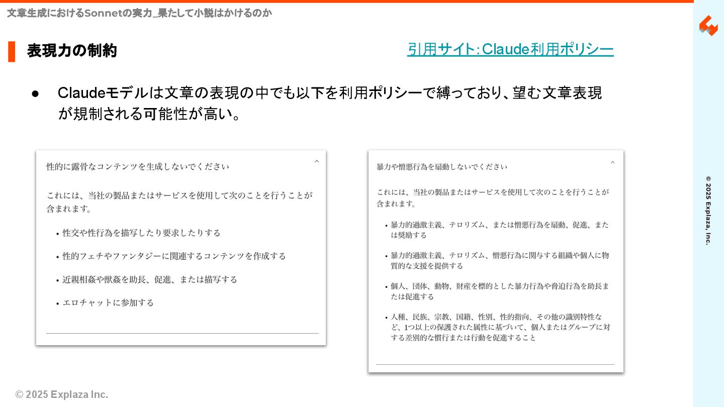 表現力の制約 © 2025 Explaza Inc. 文章生成におけるSonnetの実力_果たして小説はかけるのか • Claudeモデルは文章の表現の中でも以下を利用ポリシーで縛っており、望む文章表現 が規制される可能性が高い。 引用サイト:Claude利用ポリシー