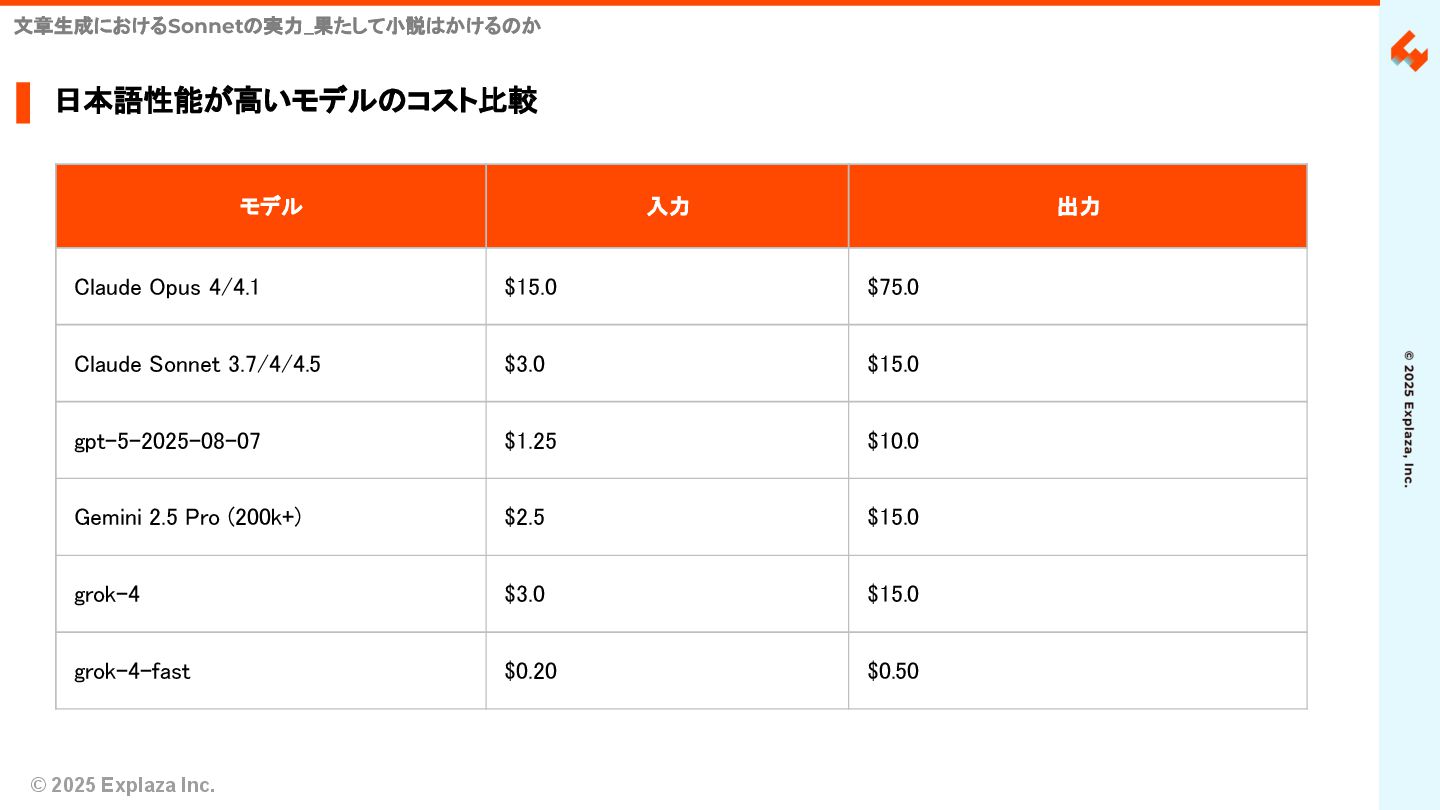 日本語性能が高いモデルのコスト比較 © 2025 Explaza Inc. 文章生成におけるSonnetの実力_果たして小説はかけるのか モデル 入力 出力