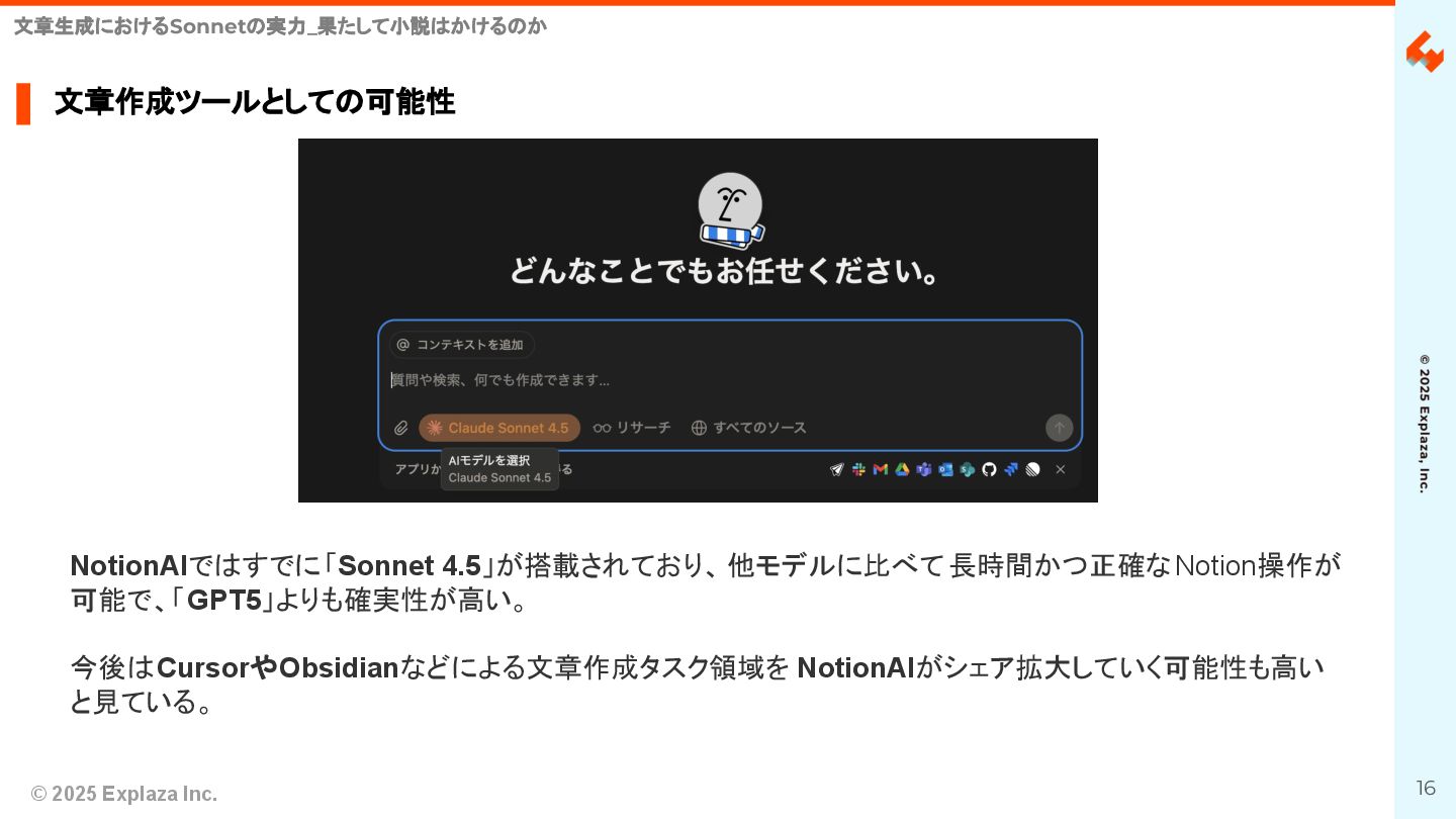 文章作成ツールとしての可能性 © 2025 Explaza Inc. 16 文章生成におけるSonnetの実力_果たして小説はかけるのか NotionAIではすでに「Sonnet 4.5」が搭載されており、 他モデルに比べて長時間かつ正確なNotion操作が