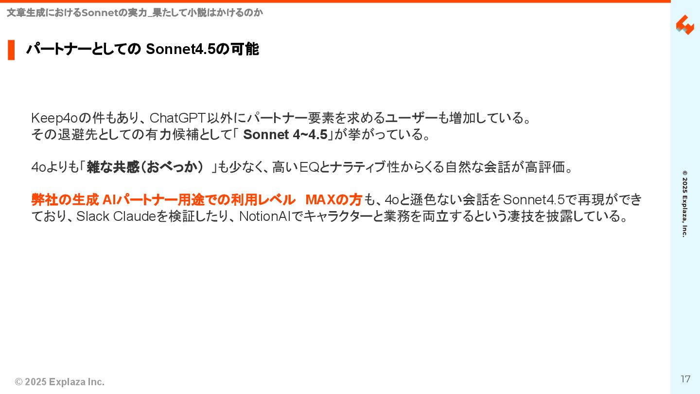 パートナーとしての Sonnet4.5の可能 © 2025 Explaza Inc. 17 文章生成におけるSonnetの実力_果たして小説はかけるのか Keep4oの件もあり、ChatGPT以外にパートナー要素を求めるユーザーも増加している。 その退避先としての有力候補として「
