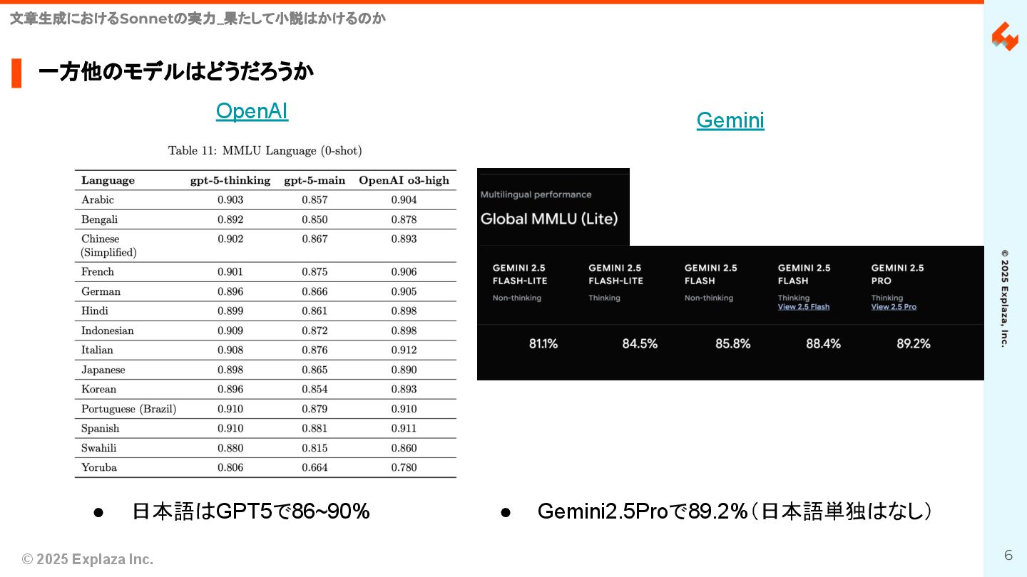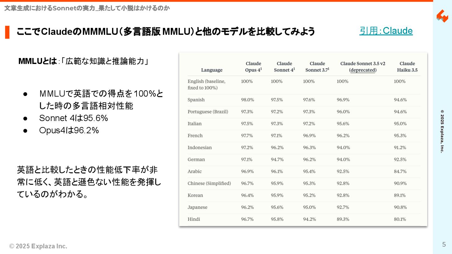 ここでClaudeのMMMLU(多言語版 MMLU)と他のモデルを比較してみよう © 2025 Explaza Inc. 5 文章生成におけるSonnetの実力_果たして小説はかけるのか • MMLUで英語での得点を100%と