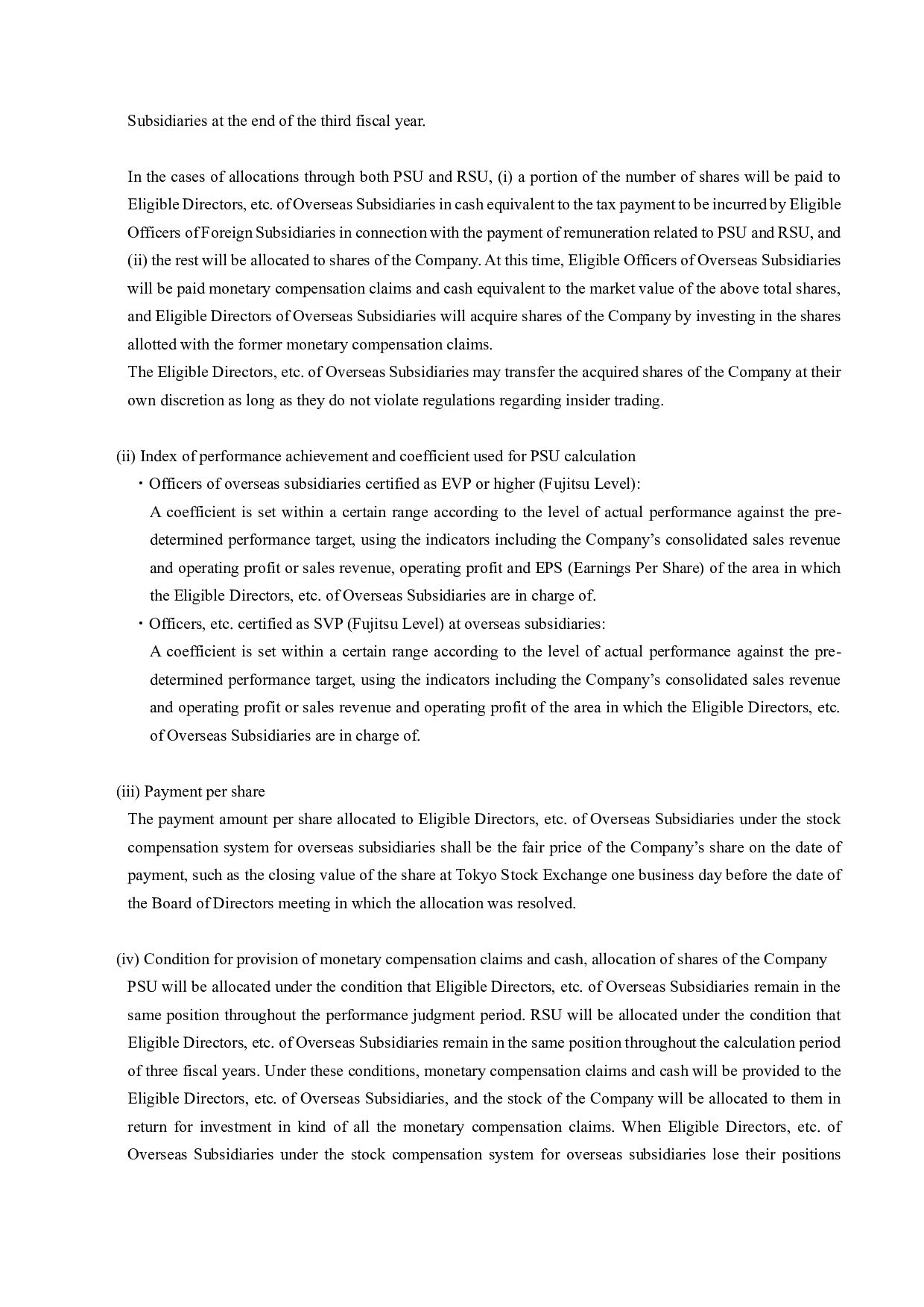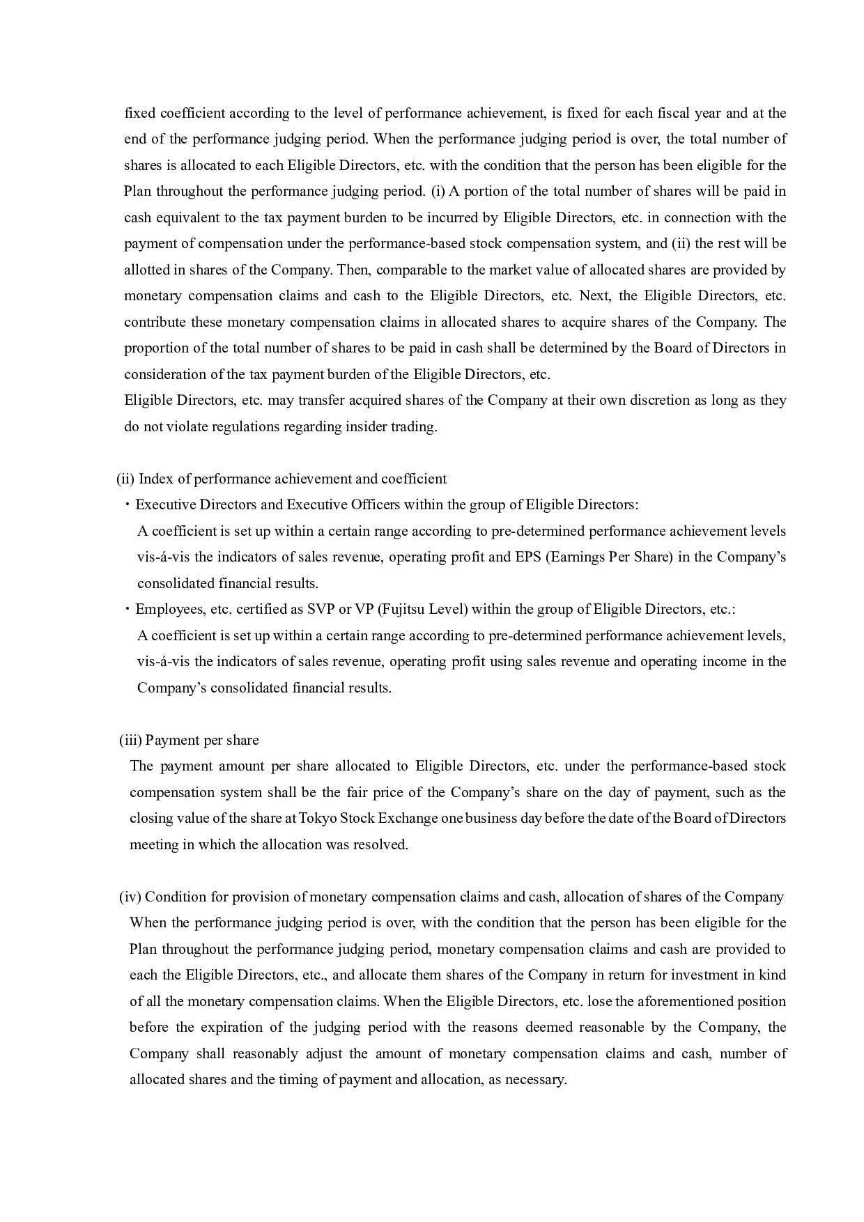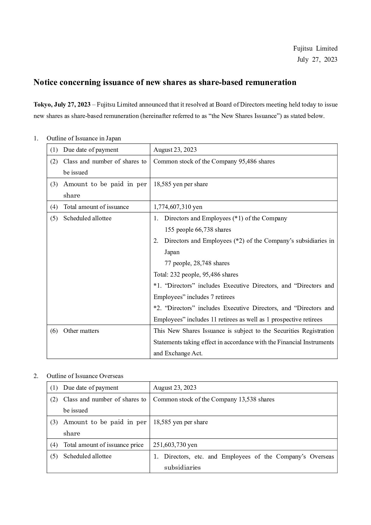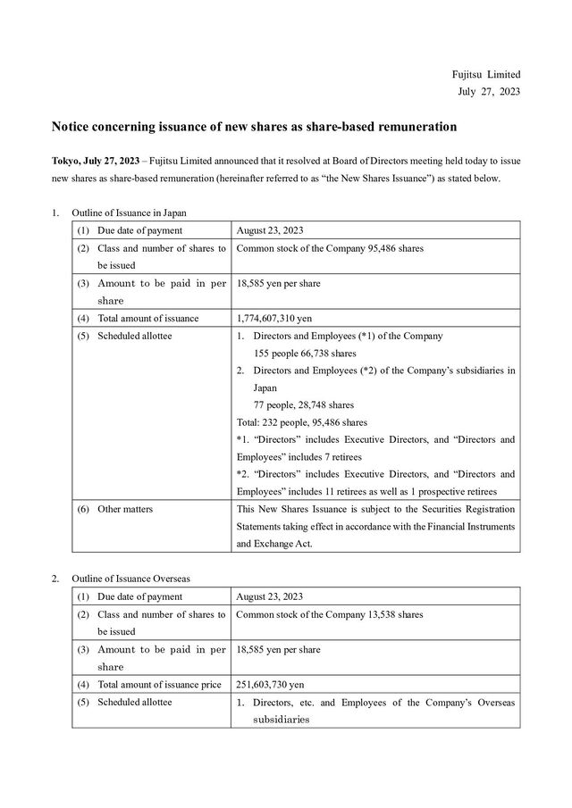 calculation period for reasons deemed reasonable by the Company, the Company shall reasonably adjust the amount of monetary compensation claims and cash to be provided, the number of shares allotted, and the timing of payment and allotment as necessary. (v) Other Handling of the stock compensation system for overseas subsidiaries at the time of restructuring and others, handling of the base number of shares at the time of stock split or stock consolidation, and other details of the system shall be determined by the regulations on stock compensation, etc. (including regulations on stock compensation of some of the Company’s overseas subsidiaries. 4. Basis of calculation of the total amount of issuance and its specific contents The total amount of issuance for the issuance of new shares is set as 18,585 yen, which is the closing price of the Company’s stock at the Tokyo Stock Exchange on July 26, 2023 (the business day prior to the date that the Board of Directors meeting made the resolution), in order to make a price free from arbitrariness. The deviation rate of this value from the simple average closing price of stock of Fujitsu in Tokyo Stock Exchange for one month (from June 27, 2023 to July 26, 2023) 18,368 yen (round off to the first decimal place, by simply averaging the closing prices, and the same applies to the following) was 1.17% (round off to the second decimal place in calculating deviation rate, and the same applies to the following), the simple average closing price for 3 months (from April 27, 2023 to July 26, 2023) 18,464 yen was 0.65%, and the simple average closing price for 6 months (from January 27, 2023 to July 26, 2023) 18,208 yen was 2.03%. The above price is the market price immediately before the date of determination on the issuance of new shares by the Board of Directors meeting, which is pursuant to the “guidance on handling of stock increase by third- party allotment” by the Japan Securities Dealers Association, and Fujitsu considers it rational and not unusually favorable to the recipients. 5. Matters concerning the procedure required by the corporate code of conduct The issuance of new shares does not require an opinion from an independent third party or require procedures for confirming the intent of shareholders, which are provided for under Rule 432 of the Securities Listing Regulations of the Tokyo Stock Exchange, because (i) the dilution ratio is less than 25% and (ii) the Treasury Stock Disposal does not involve a change in controlling shareholder. Press Contacts: Fujitsu Limited Public and Investor Relations Division Inquiries: https://www.fujitsu.com/global/about/resources/news/presscontacts/form/index.html About Fujitsu Fujitsu’s purpose is to make the world more sustainable by building trust in society through innovation. As the digital transformation partner of choice for customers in over 100 countries, our 124,000 employees work to resolve some