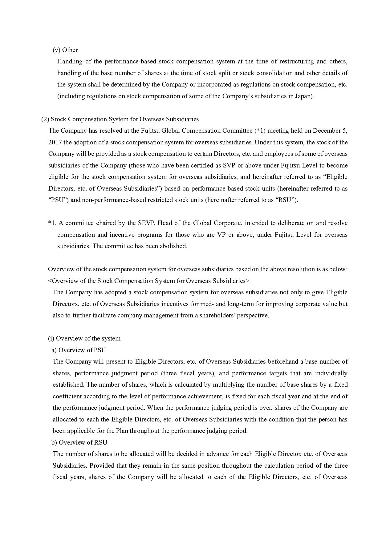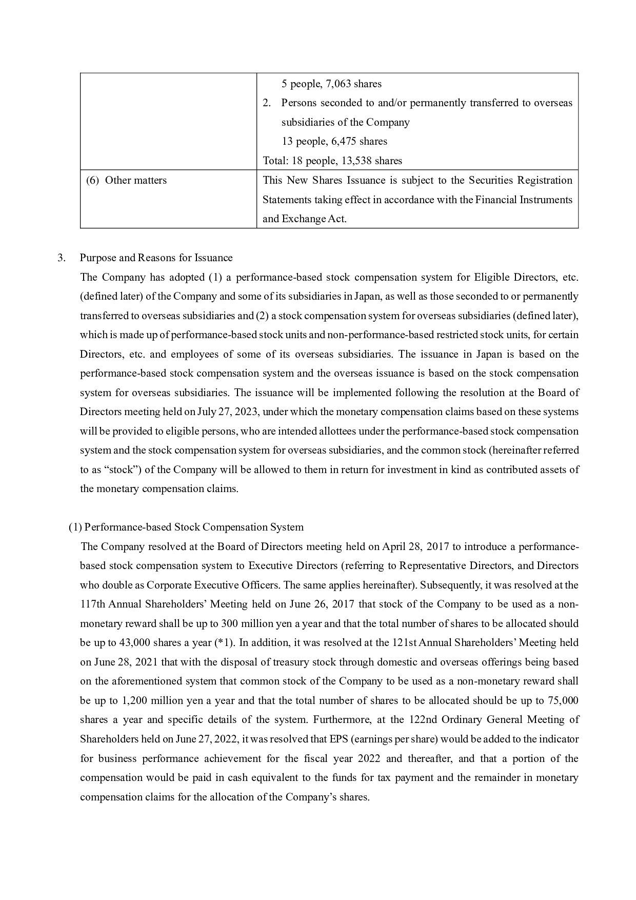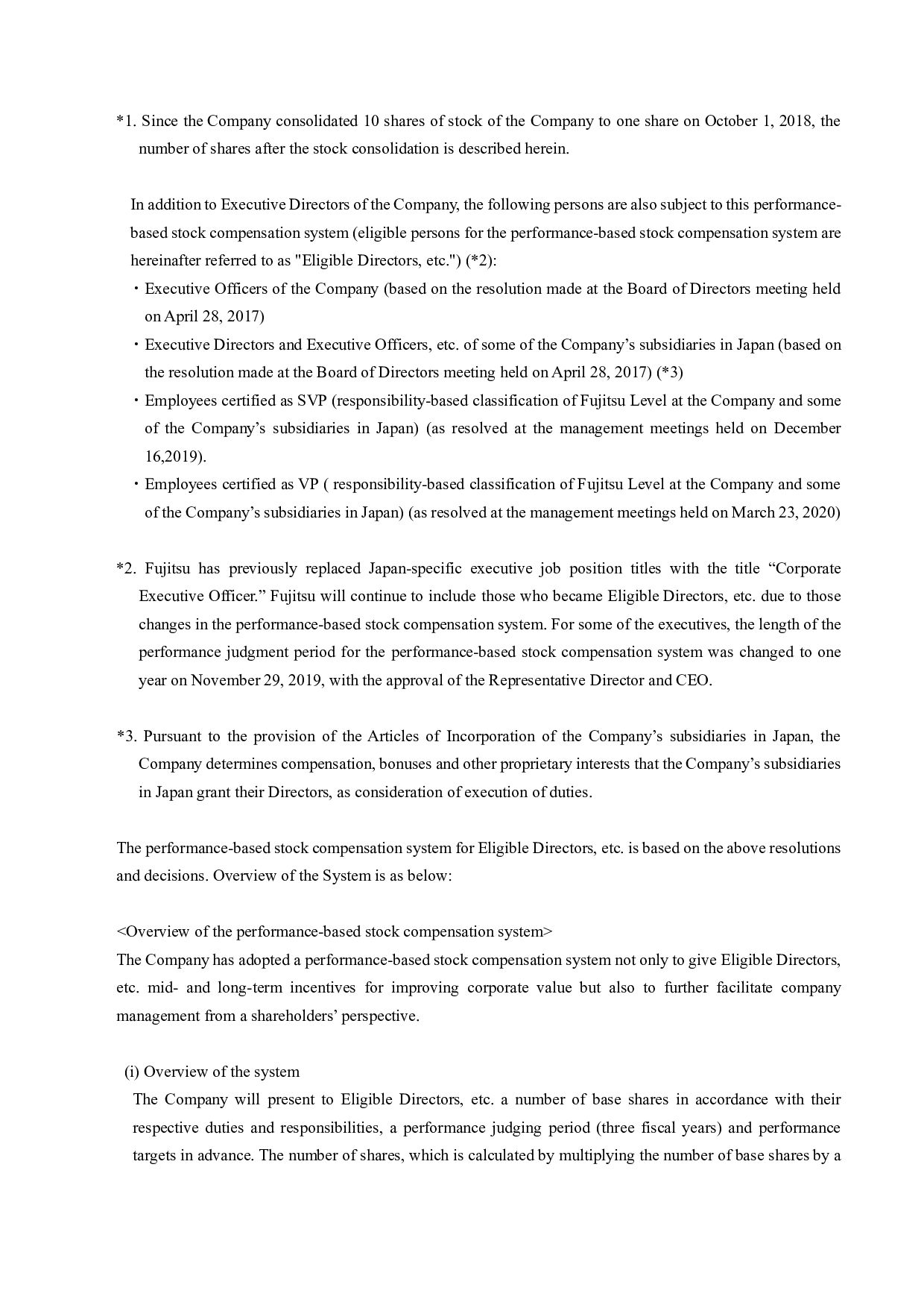 calculation period for reasons deemed reasonable by the Company, the Company shall reasonably adjust the amount of monetary compensation claims and cash to be provided, the number of shares allotted, and the timing of payment and allotment as necessary. (v) Other Handling of the stock compensation system for overseas subsidiaries at the time of restructuring and others, handling of the base number of shares at the time of stock split or stock consolidation, and other details of the system shall be determined by the regulations on stock compensation, etc. (including regulations on stock compensation of some of the Company’s overseas subsidiaries. 4. Basis of calculation of the total amount of issuance and its specific contents The total amount of issuance for the issuance of new shares is set as 18,585 yen, which is the closing price of the Company’s stock at the Tokyo Stock Exchange on July 26, 2023 (the business day prior to the date that the Board of Directors meeting made the resolution), in order to make a price free from arbitrariness. The deviation rate of this value from the simple average closing price of stock of Fujitsu in Tokyo Stock Exchange for one month (from June 27, 2023 to July 26, 2023) 18,368 yen (round off to the first decimal place, by simply averaging the closing prices, and the same applies to the following) was 1.17% (round off to the second decimal place in calculating deviation rate, and the same applies to the following), the simple average closing price for 3 months (from April 27, 2023 to July 26, 2023) 18,464 yen was 0.65%, and the simple average closing price for 6 months (from January 27, 2023 to July 26, 2023) 18,208 yen was 2.03%. The above price is the market price immediately before the date of determination on the issuance of new shares by the Board of Directors meeting, which is pursuant to the “guidance on handling of stock increase by third- party allotment” by the Japan Securities Dealers Association, and Fujitsu considers it rational and not unusually favorable to the recipients. 5. Matters concerning the procedure required by the corporate code of conduct The issuance of new shares does not require an opinion from an independent third party or require procedures for confirming the intent of shareholders, which are provided for under Rule 432 of the Securities Listing Regulations of the Tokyo Stock Exchange, because (i) the dilution ratio is less than 25% and (ii) the Treasury Stock Disposal does not involve a change in controlling shareholder. Press Contacts: Fujitsu Limited Public and Investor Relations Division Inquiries: https://www.fujitsu.com/global/about/resources/news/presscontacts/form/index.html About Fujitsu Fujitsu’s purpose is to make the world more sustainable by building trust in society through innovation. As the digital transformation partner of choice for customers in over 100 countries, our 124,000 employees work to resolve some