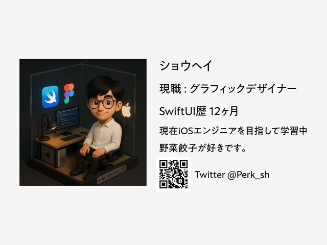 ショウヘイ 現職 : グラフィックデザイナー SwiftUI歴 12ヶ月 現在iOSエンジニアを目指して学習中 野菜餃子が好きです。 Twitter @Perk_sh