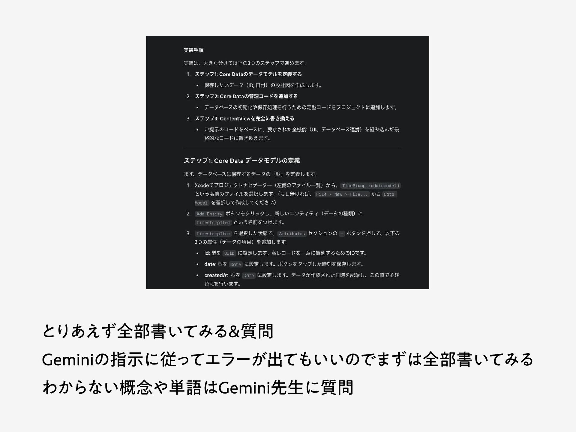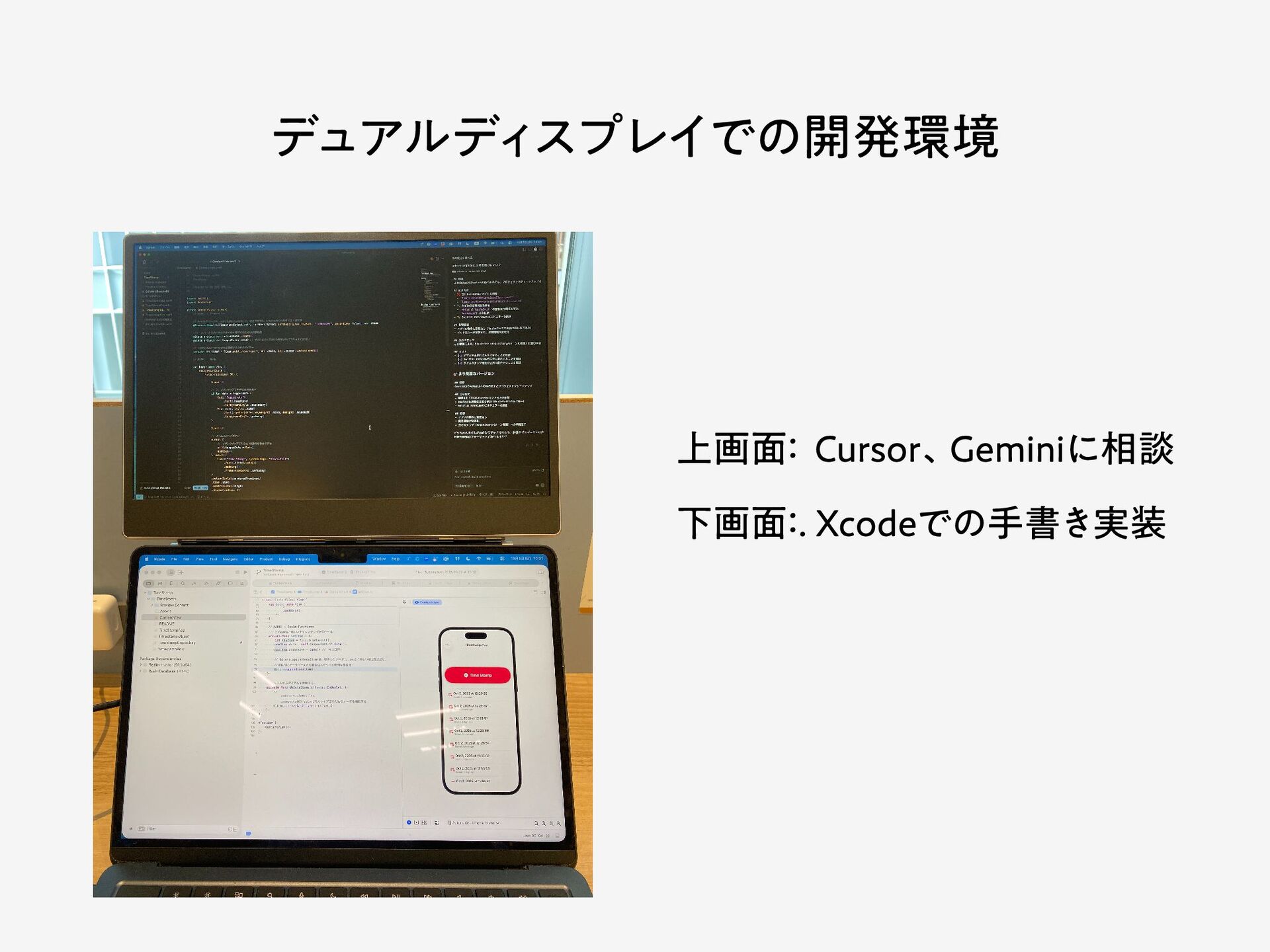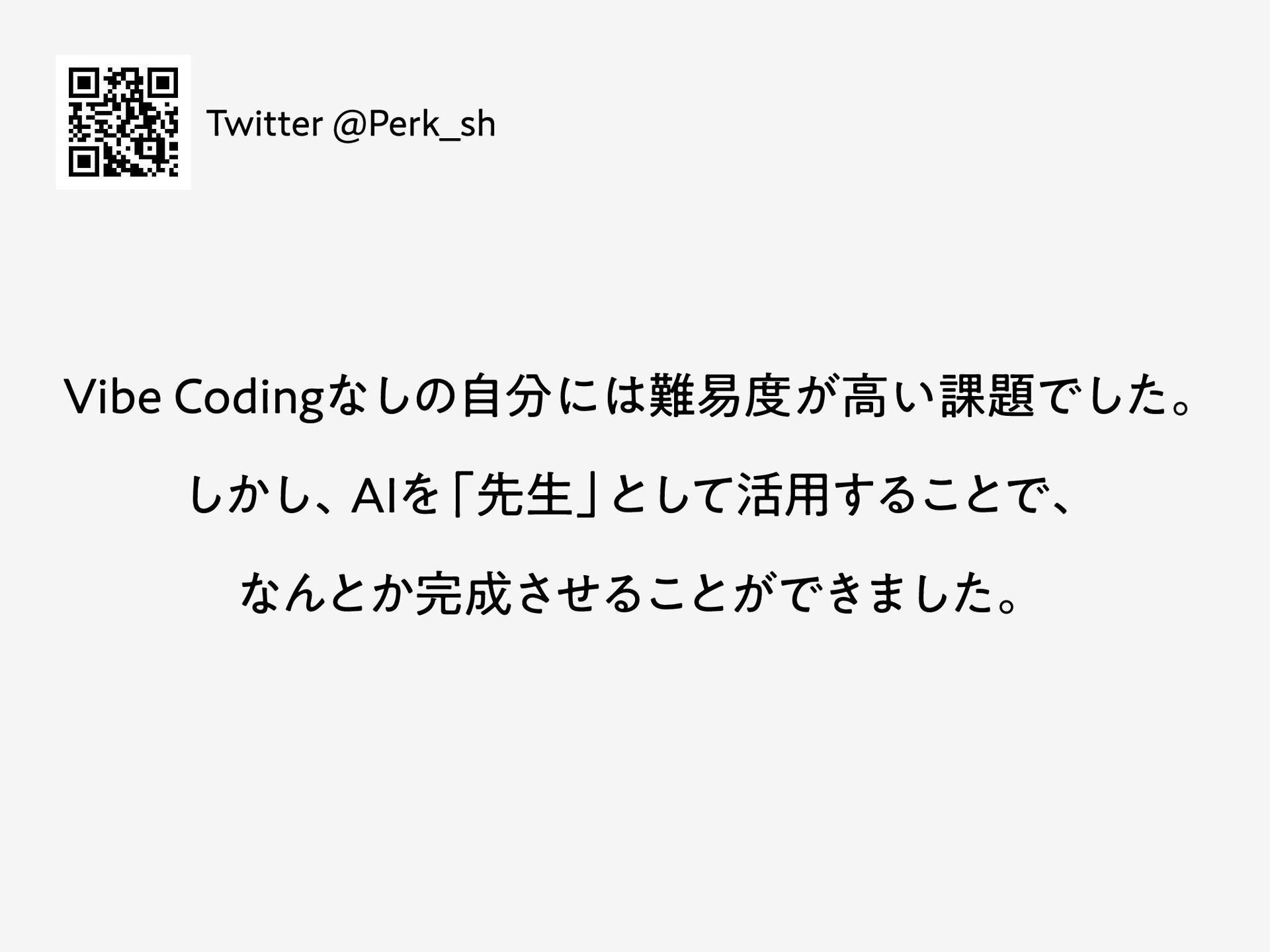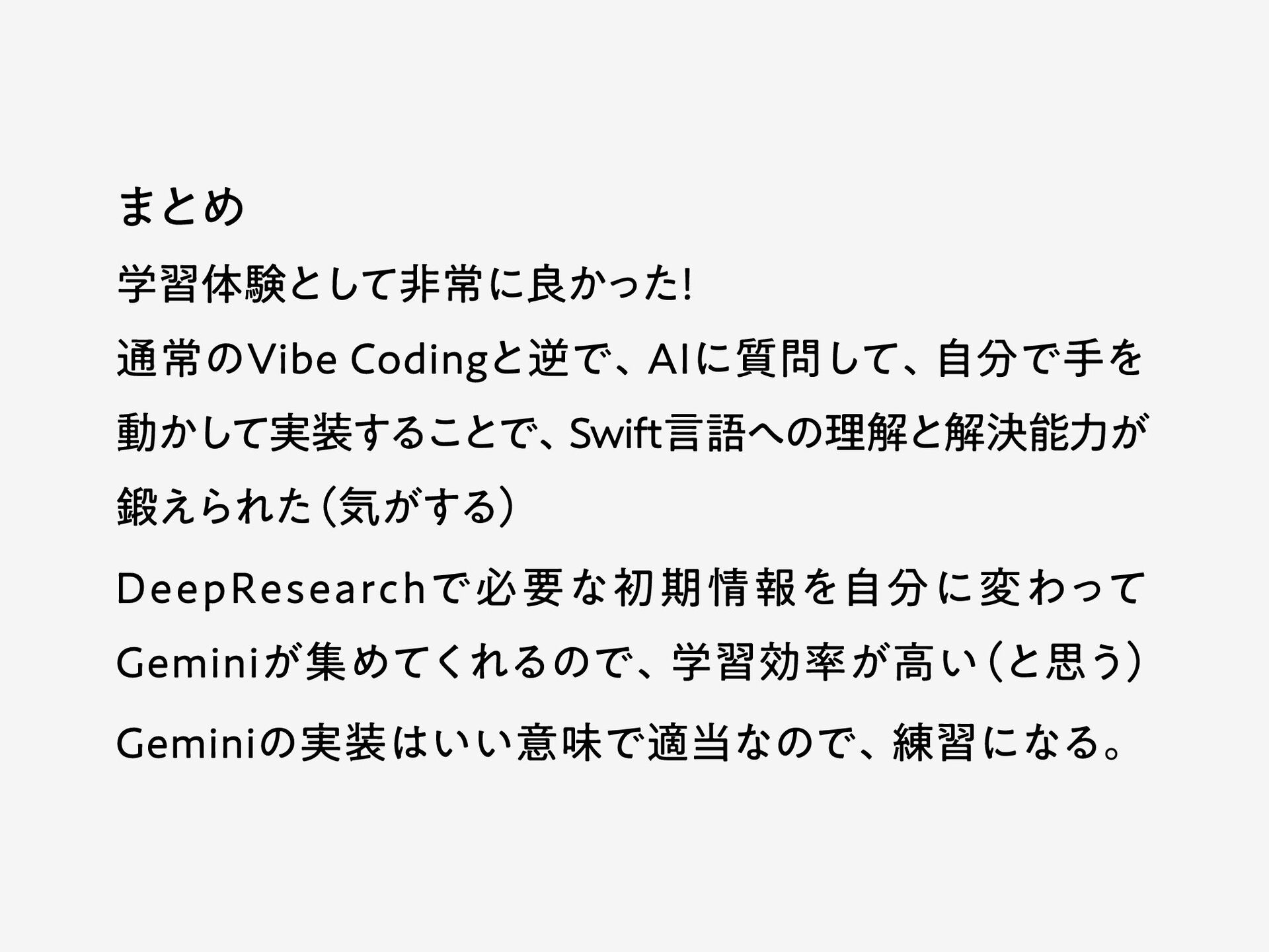 通常のVibe Codingと逆で、AIに質問して、自分で手を動かして実装することで、Swift言語への理解とエラー解決能力が鍛えられた(気がする)
