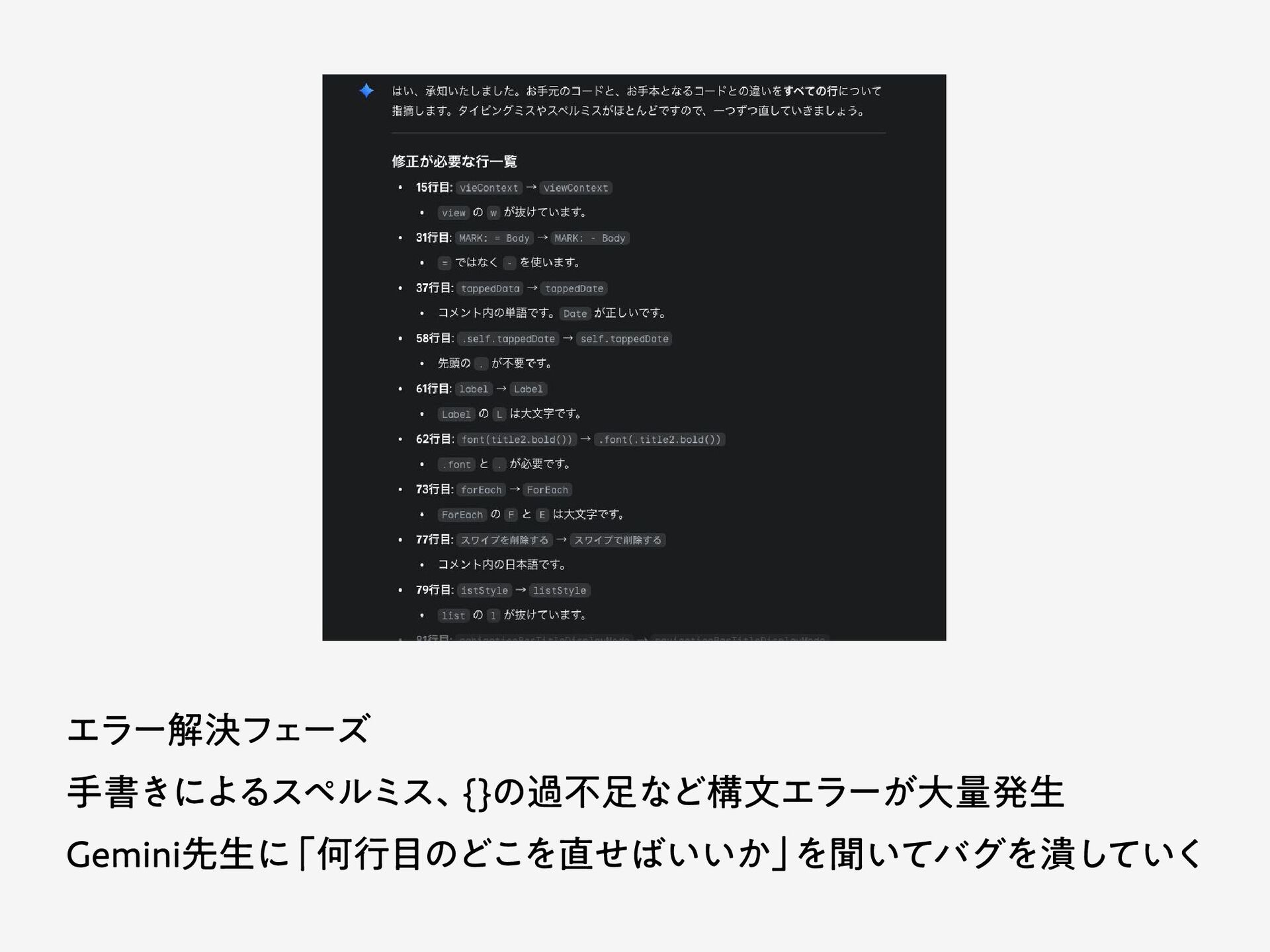 Gemini先生に「何行目のどこを直せばいいか」を聞いてバグを潰していく