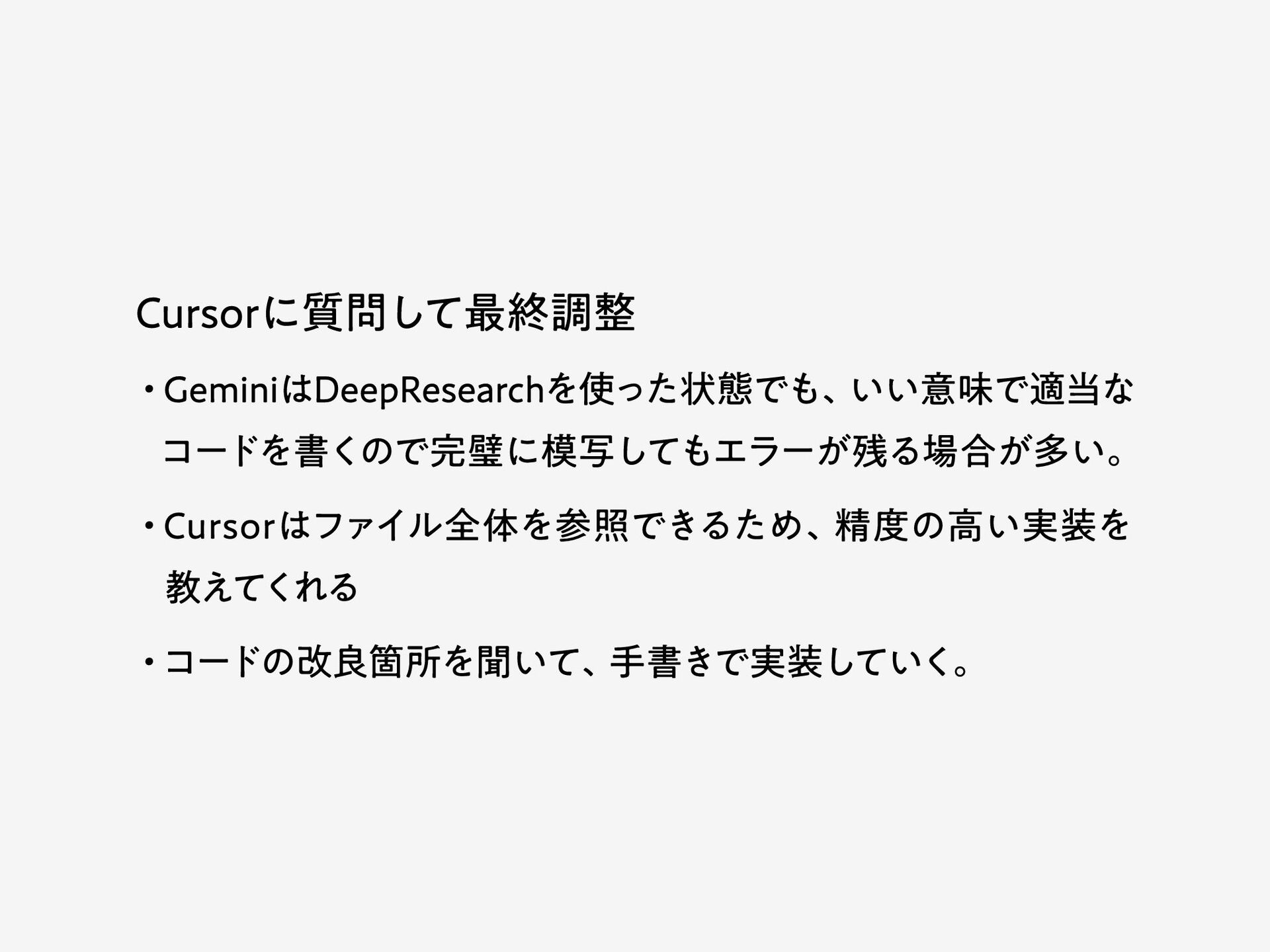 Geminiの作ったコードの改良箇所を聞いて、手書きで実装していく。