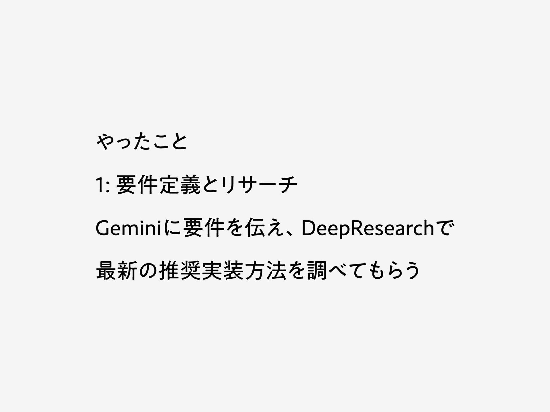 Geminiに要件を伝え、DeepResearchで最新の推奨実装方法を調べてもらう