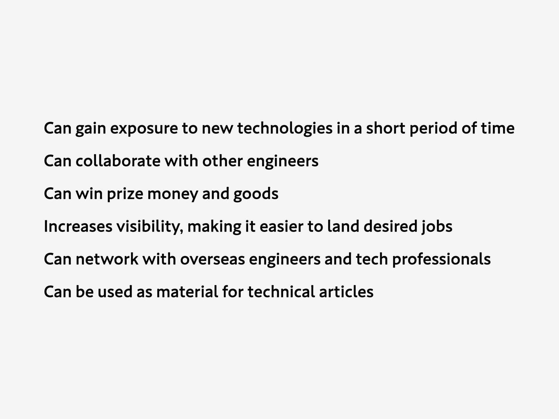of time Can collaborate with other engineers Can win prize money and goods Increases visibility, making it easier to land desired jobs Can network with overseas engineers and tech professionals Can be used as material for technical articles