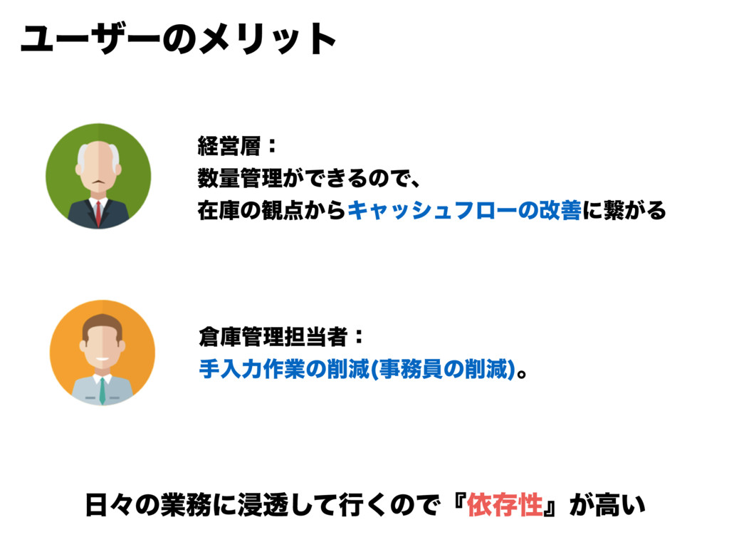 ϢʔβʔͷϝϦοτ ܦӦɿ ྔཧ͕Ͱ͖ΔͷͰɺ ࡏݿͷ؍͔ΒΩϟογϡϑϩʔͷվળʹܨ͕Δ ݿཧ୲ऀɿ खೖྗ࡞ۀͷݮ ࣄһͷݮ ɻ ʑͷۀʹਁಁͯ͠ߦ͘ͷͰʰґଘੑʱ͕ߴ͍