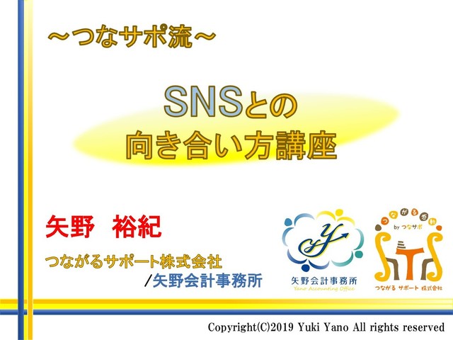 2019年6月23日にZOOMで開催した「つなサポ流・SNSとの向き合い方講座」のスライドです。SNSを通じて、自分の仕事と向き合い、自分の価値を探し、伝えるチャレンジをしてきた1年半の経験を、参加者の皆さまの何かの“キッカケ”にしていただくべく開催しました。