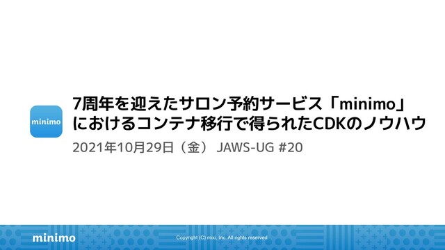 来年1月で8周年を迎えるサロンスタッフ予約サービス「minimo」において、Amazon ECS・AWS CDKを利用したコンテナ移行を行いました。 本セッションでは、その事例とともに、移行時に得られたノウハウを紹介できればと思います。