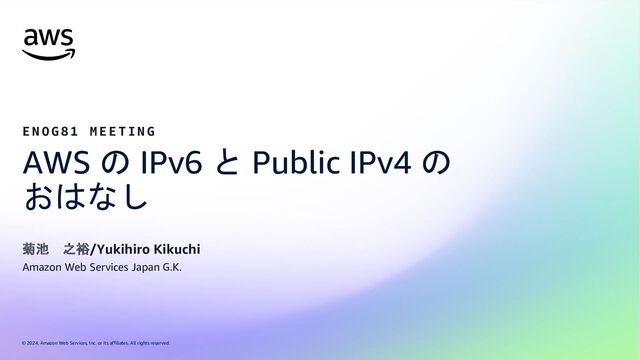 rights reserved. Amazon Linux 2023 から見た IPv6 4 [ec2-user@ip-10-4-7-67 ~]$ ip -d a 1: lo: <LOOPBACK,UP,LOWER_UP> mtu 65536 qdisc noqueue state UNKNOWN group default qlen 1000 link/loopback 00:00:00:00:00:00 brd 00:00:00:00:00:00 promiscuity 0 minmtu 0 maxmtu 0 numtxqueues 1 numrxqueues 1 gso_max_size 65536 gso_max_segs 65535 inet 127.0.0.1/8 scope host lo valid_lft forever preferred_lft forever inet6 ::1/128 scope host valid_lft forever preferred_lft forever 2: enX0: <BROADCAST,MULTICAST,UP,LOWER_UP> mtu 9001 qdisc fq_codel state UP group default qlen 1000 link/ether 06:c7:51:ee:79:df brd ff:ff:ff:ff:ff:ff promiscuity 0 minmtu 68 maxmtu 65535 numtxqueues 1 numrxqueues 1 gso_max_size 65536 gso_max_segs 65535 altname eni-0a669e62d4a866cc7 altname device-number-0 inet 10.4.7.67/20 metric 512 brd 10.4.15.255 scope global dynamic enX0 # IPv4 プライベートアドレス valid_lft 3343sec preferred_lft 3343sec inet6 2406:da14:f9:f100:89b0:6140:148:e9d0/128 scope global dynamic noprefixroute # IPv6 グローバルユニキャストアドレス valid_lft 382sec preferred_lft 72sec inet6 fe80::4c7:51ff:feee:79df/64 scope link # IPv6 リンクローカルアドレス valid_lft forever preferred_lft forever 1 つのインターフェースに IPv4 と IPv6 が共存している IPv6 を使ってインターネットを利用するとき、グローバルユニキャストアドレスで通信する ローカルネットワークの通信では、リンクローカルアドレスを利用する場合もある
