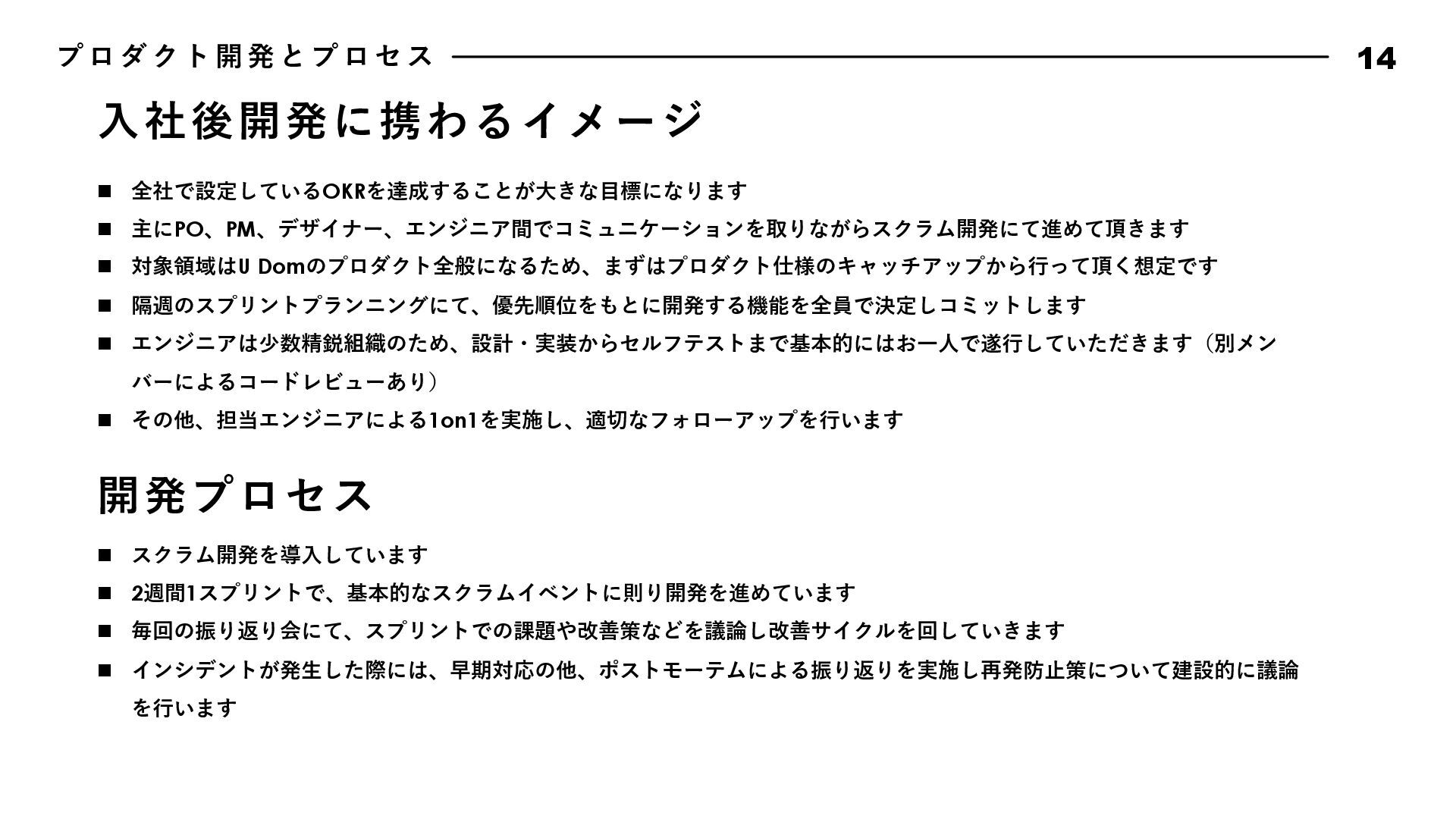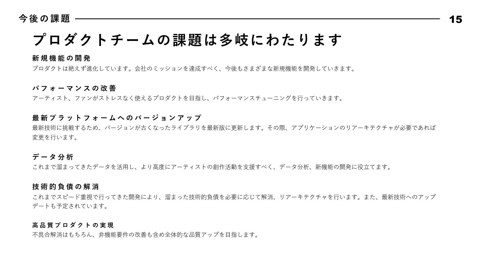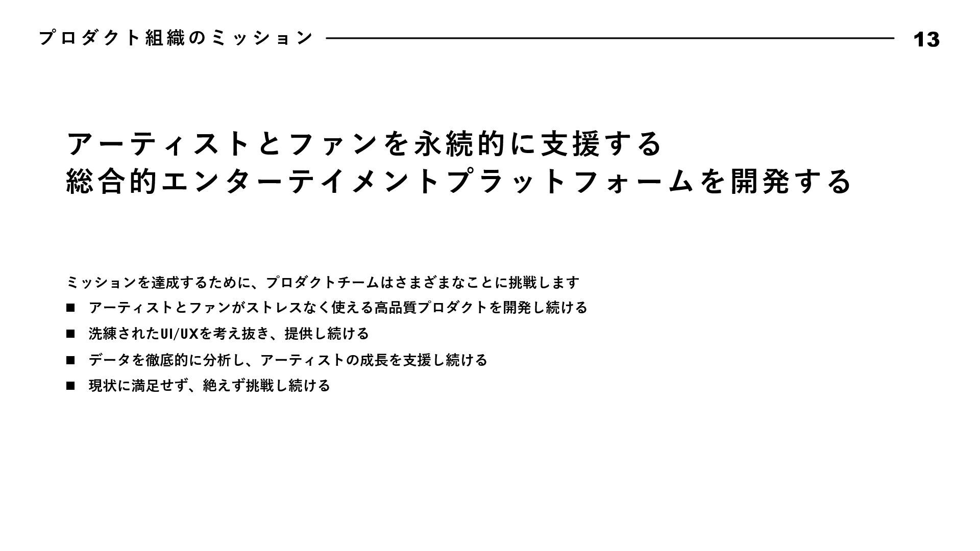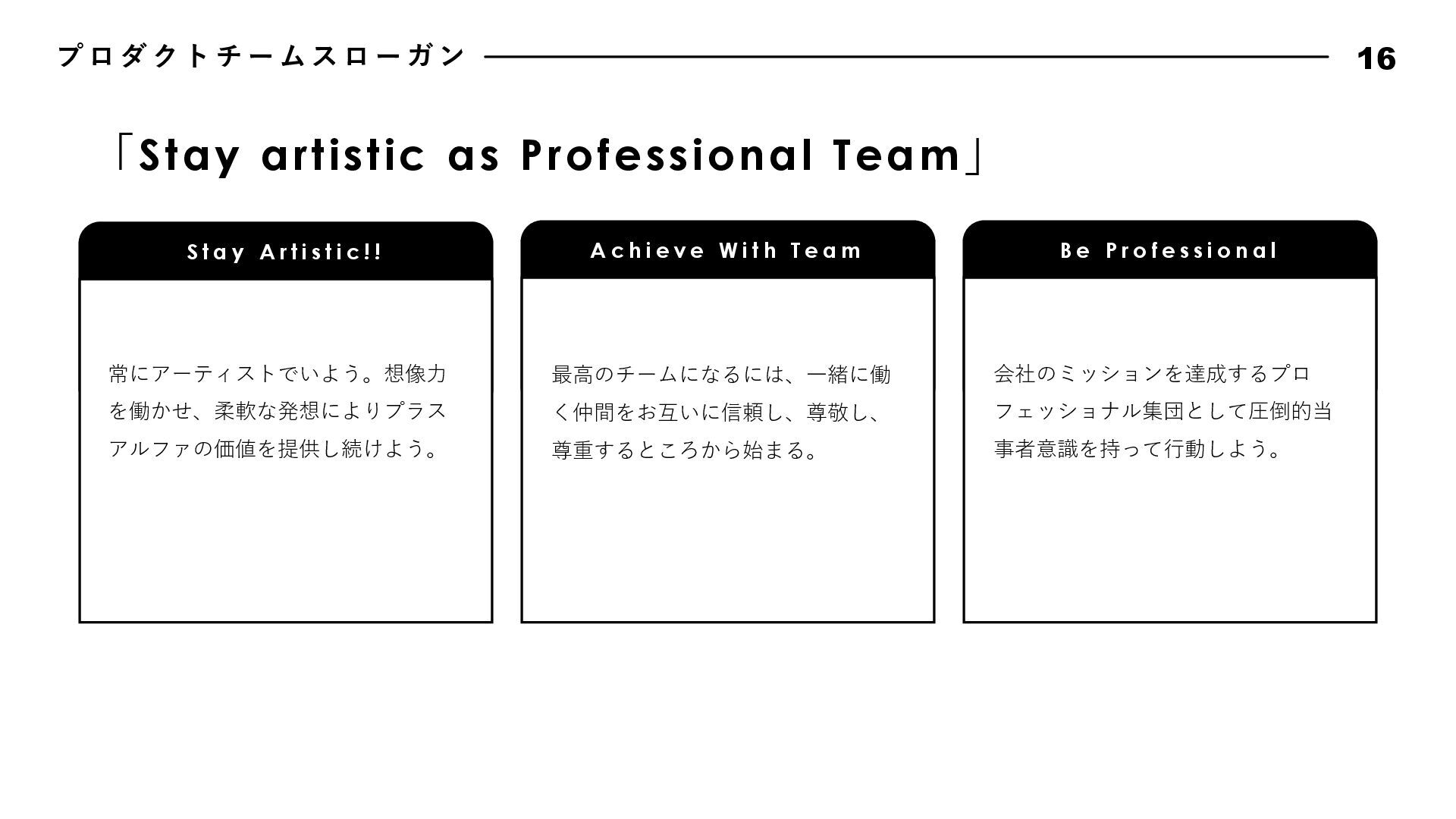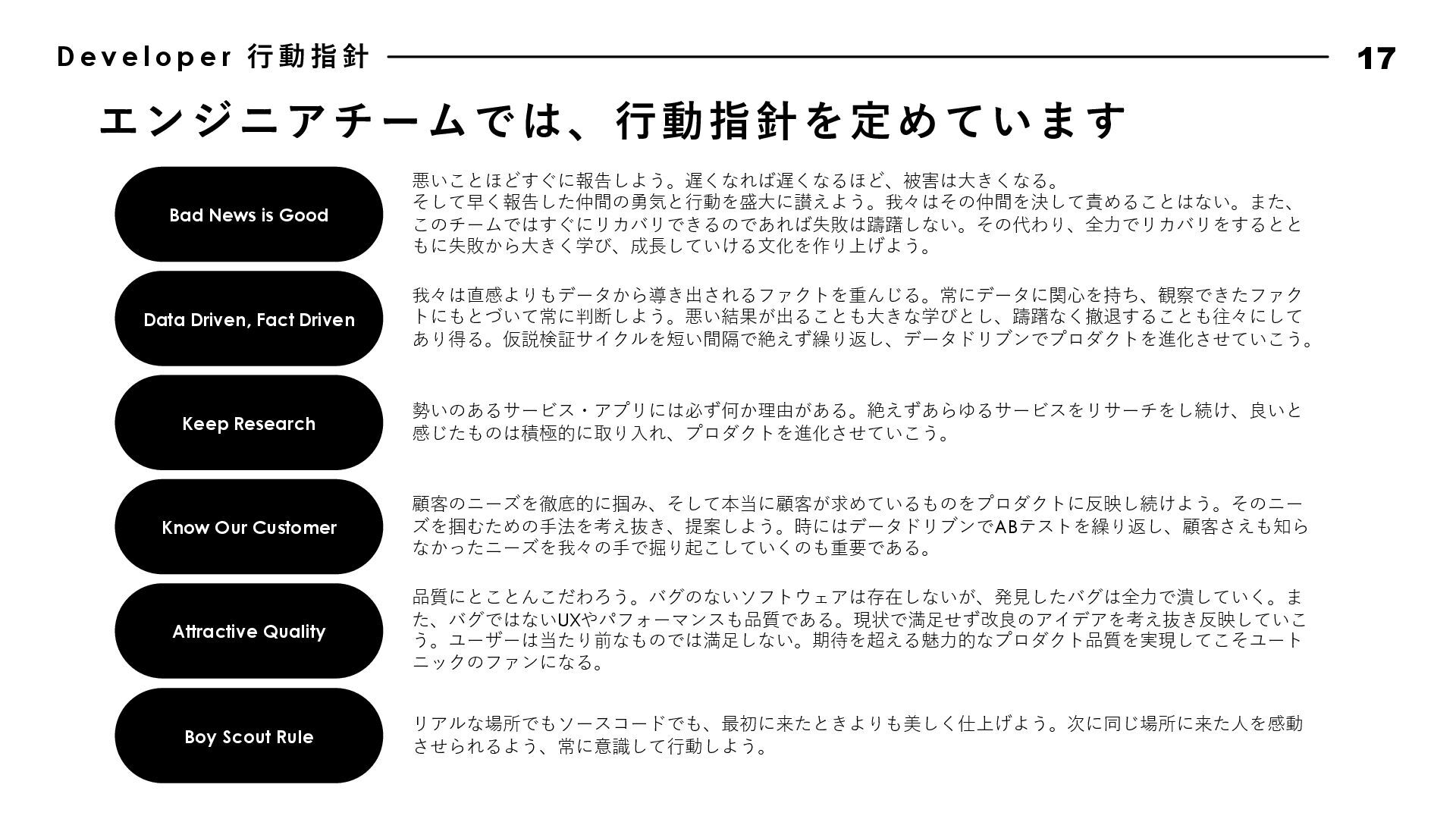 動 指 針 17 Bad News is Good Data Driven, Fact Driven Keep Research Know Our Customer Attractive Quality Boy Scout Rule 悪いことほどすぐに報告しよう。遅くなれば遅くなるほど、被害は⼤きくなる。 そして早く報告した仲間の勇気と⾏動を盛⼤に讃えよう。我々はその仲間を決して責めることはない。また、 このチームではすぐにリカバリできるのであれば失敗は躊躇しない。その代わり、全⼒でリカバリをするとと もに失敗から⼤きく学び、成⻑していける⽂化を作り上げよう。 我々は直感よりもデータから導き出されるファクトを重んじる。常にデータに関⼼を持ち、観察できたファク トにもとづいて常に判断しよう。悪い結果が出ることも⼤きな学びとし、躊躇なく撤退することも往々にして あり得る。仮説検証サイクルを短い間隔で絶えず繰り返し、データドリブンでプロダクトを進化させていこう。 勢いのあるサービス・アプリには必ず何か理由がある。絶えずあらゆるサービスをリサーチをし続け、良いと 感じたものは積極的に取り⼊れ、プロダクトを進化させていこう。 顧客のニーズを徹底的に掴み、そして本当に顧客が求めているものをプロダクトに反映し続けよう。そのニー ズを掴むための⼿法を考え抜き、提案しよう。時にはデータドリブンでABテストを繰り返し、顧客さえも知ら なかったニーズを我々の⼿で掘り起こしていくのも重要である。 品質にとことんこだわろう。バグのないソフトウェアは存在しないが、発⾒したバグは全⼒で潰していく。ま た、バグではないUXやパフォーマンスも品質である。現状で満⾜せず改良のアイデアを考え抜き反映していこ う。ユーザーは当たり前なものでは満⾜しない。期待を超える魅⼒的なプロダクト品質を実現してこそユート ニックのファンになる。 リアルな場所でもソースコードでも、最初に来たときよりも美しく仕上げよう。次に同じ場所に来た⼈を感動 させられるよう、常に意識して⾏動しよう。 エンジニアチームでは、⾏動指針を定めています