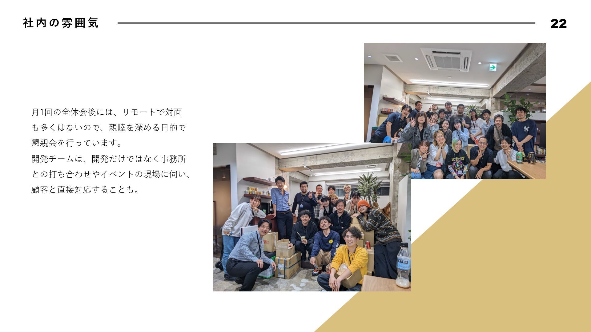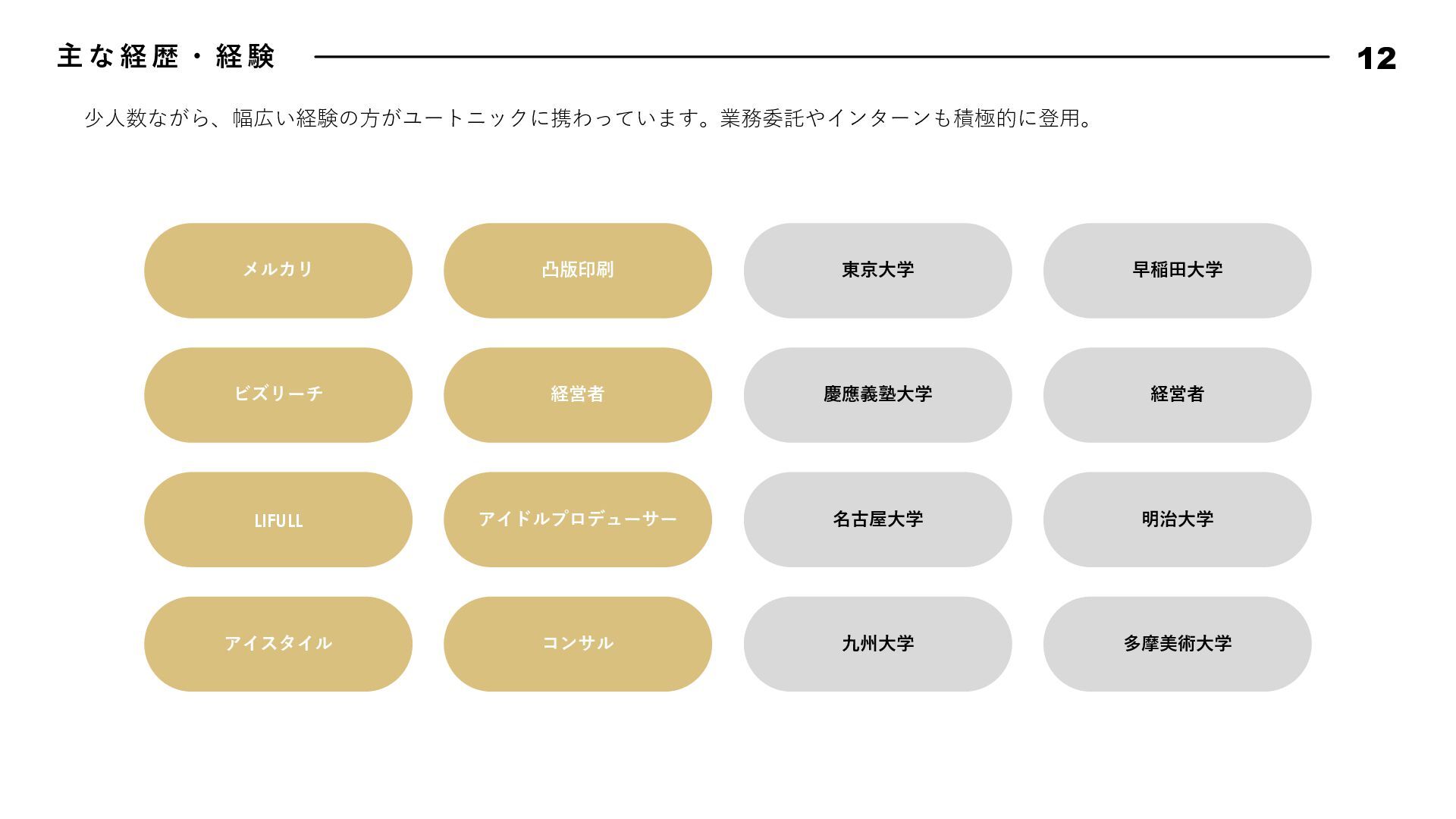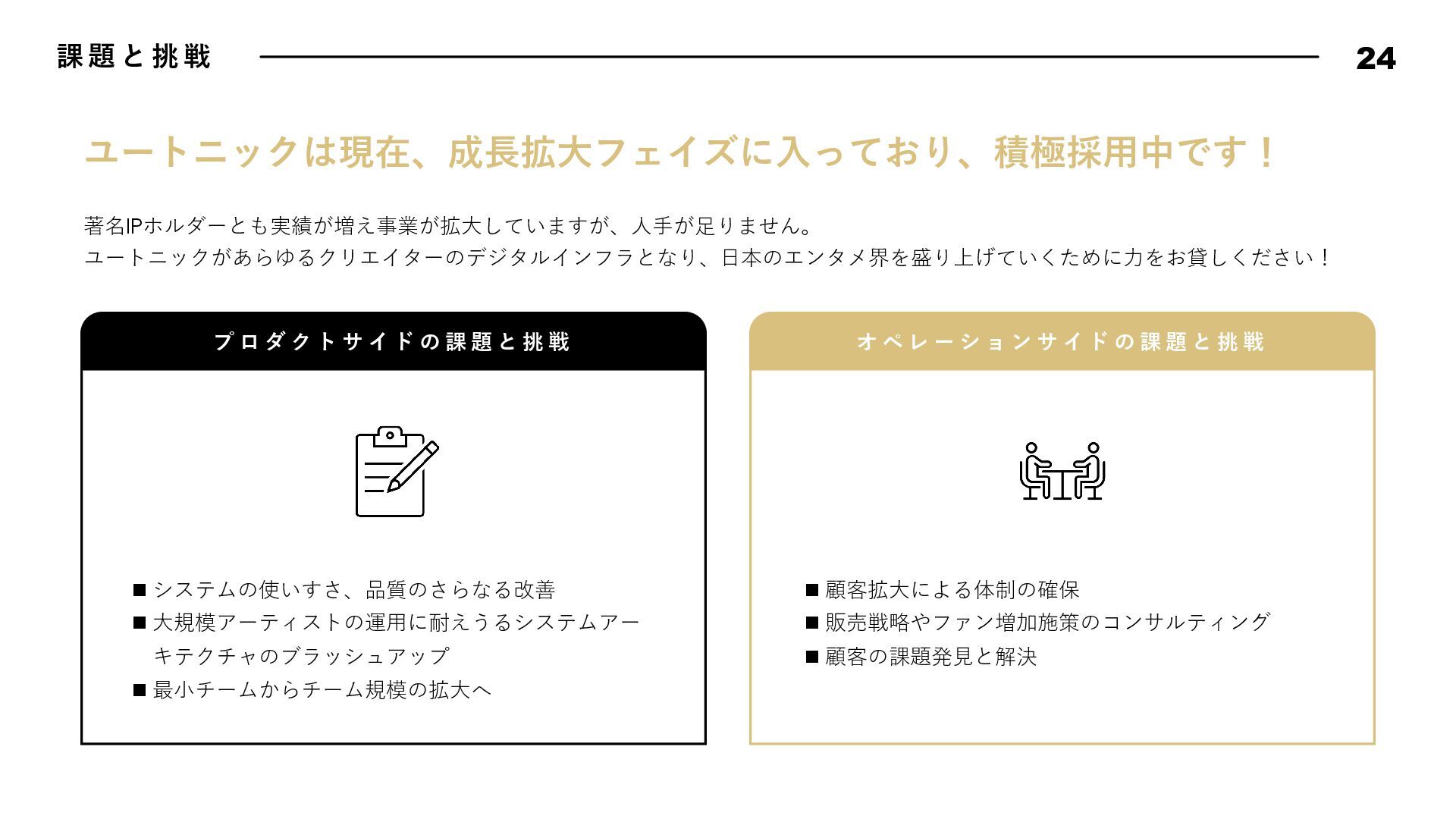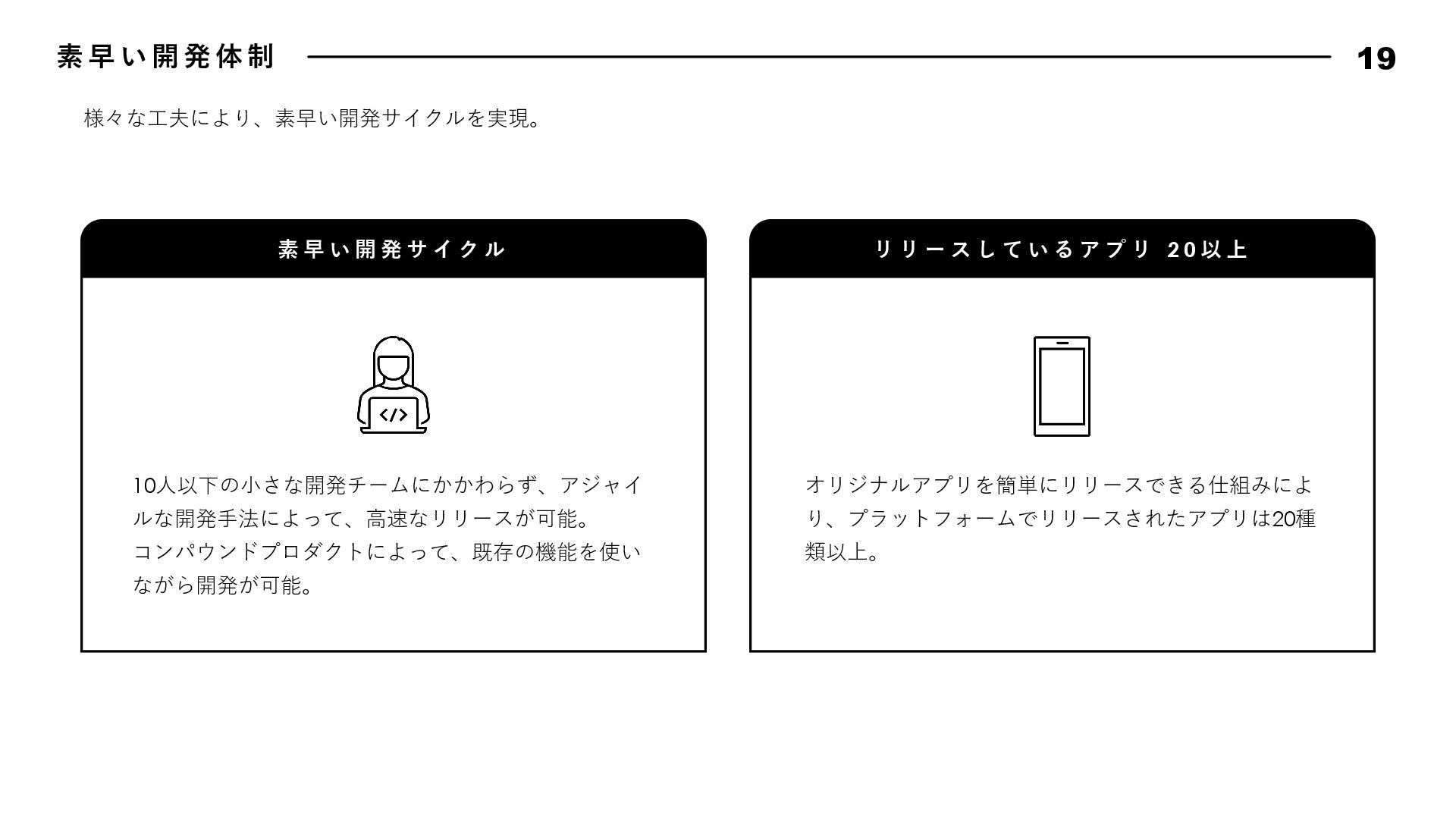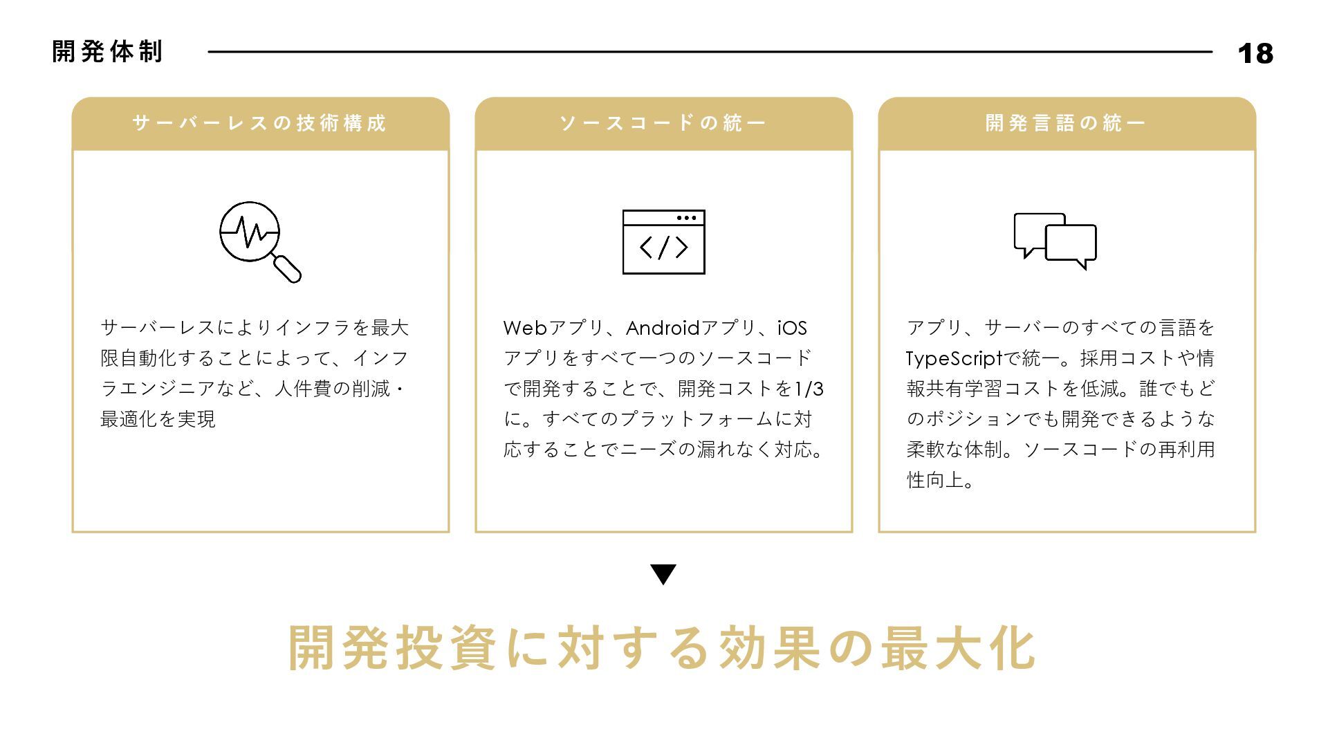 動 指 針 17 Bad News is Good Data Driven, Fact Driven Keep Research Know Our Customer Attractive Quality Boy Scout Rule 悪いことほどすぐに報告しよう。遅くなれば遅くなるほど、被害は⼤きくなる。 そして早く報告した仲間の勇気と⾏動を盛⼤に讃えよう。我々はその仲間を決して責めることはない。また、 このチームではすぐにリカバリできるのであれば失敗は躊躇しない。その代わり、全⼒でリカバリをするとと もに失敗から⼤きく学び、成⻑していける⽂化を作り上げよう。 我々は直感よりもデータから導き出されるファクトを重んじる。常にデータに関⼼を持ち、観察できたファク トにもとづいて常に判断しよう。悪い結果が出ることも⼤きな学びとし、躊躇なく撤退することも往々にして あり得る。仮説検証サイクルを短い間隔で絶えず繰り返し、データドリブンでプロダクトを進化させていこう。 勢いのあるサービス・アプリには必ず何か理由がある。絶えずあらゆるサービスをリサーチをし続け、良いと 感じたものは積極的に取り⼊れ、プロダクトを進化させていこう。 顧客のニーズを徹底的に掴み、そして本当に顧客が求めているものをプロダクトに反映し続けよう。そのニー ズを掴むための⼿法を考え抜き、提案しよう。時にはデータドリブンでABテストを繰り返し、顧客さえも知ら なかったニーズを我々の⼿で掘り起こしていくのも重要である。 品質にとことんこだわろう。バグのないソフトウェアは存在しないが、発⾒したバグは全⼒で潰していく。ま た、バグではないUXやパフォーマンスも品質である。現状で満⾜せず改良のアイデアを考え抜き反映していこ う。ユーザーは当たり前なものでは満⾜しない。期待を超える魅⼒的なプロダクト品質を実現してこそユート ニックのファンになる。 リアルな場所でもソースコードでも、最初に来たときよりも美しく仕上げよう。次に同じ場所に来た⼈を感動 させられるよう、常に意識して⾏動しよう。 エンジニアチームでは、⾏動指針を定めています