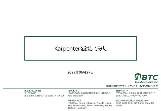 Hoang Hoa Tham Street, Thuy Khue ward, Tay Ho District, Hanoi city 西日本オフィス 〒530-0001 大阪府大阪市北区梅田2-2-2 ヒルトンプラザウエストオフィスタワー19F シリコンバレーインキュベーションセンター 3350 Scott Blvd. #29 Santa Clara, CA 95054 東京オフィス(本社) 〒108-0073 東京都港区三田3-13-16 三田43MTビル12F 株式会社ビッグツリーテクノロジー&コンサルティング Karpenterを試してみた 2022年06月27日