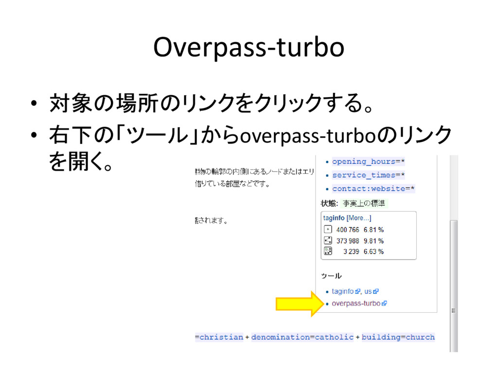 Overpass-turbo • 対象の場所のリンクをクリックする。 • 右下の「ツール」からoverpass-turboのリンク を開く。