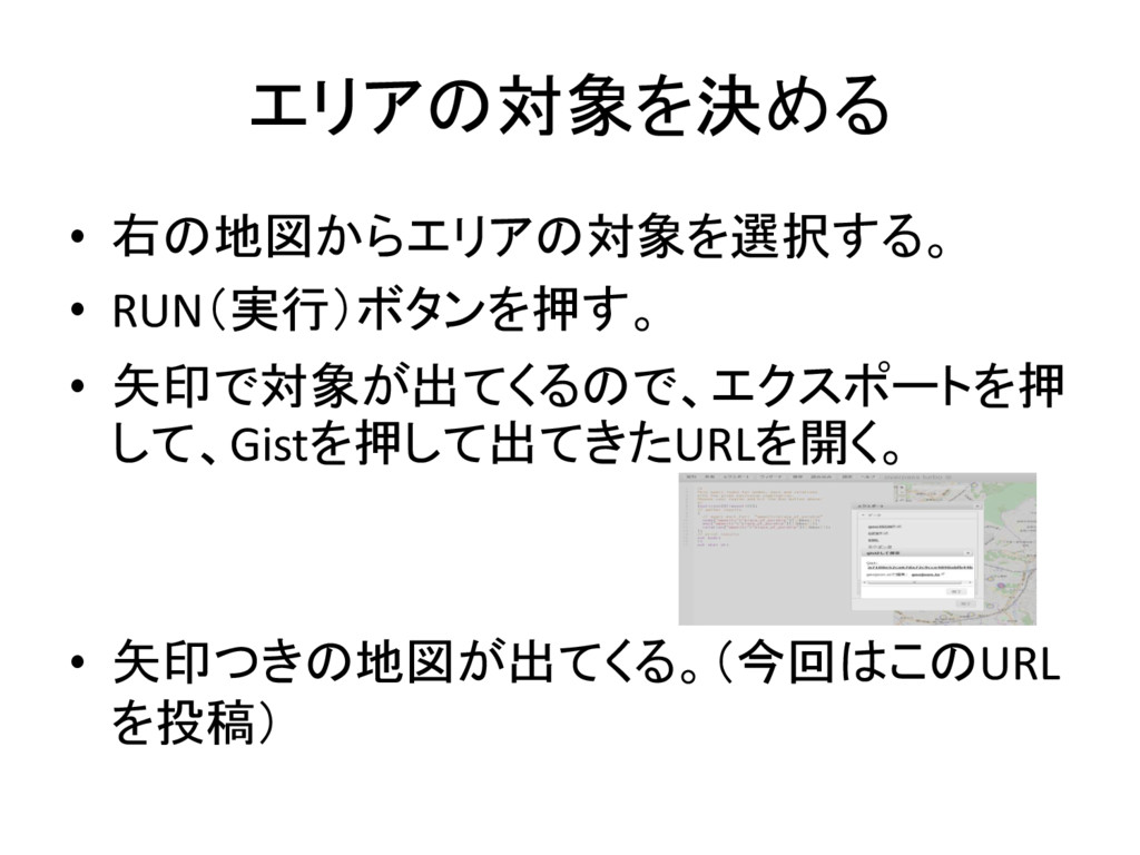 エリアの対象を決める • 右の地図からエリアの対象を選択する。 • RUN(実行)ボタンを押す。 • 矢印で対象が出てくるので、エクスポートを押 して、Gistを押して出てきたURLを開く。 • 矢印つきの地図が出てくる。(今回はこのURL
