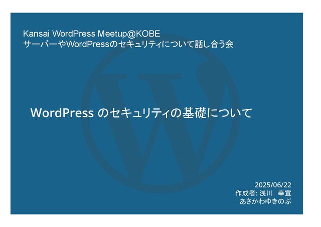 2025/06/22 作成者: 浅川 幸宣 あさかわゆきのぶ WordPress のセキュリティの基礎について Kansai WordPress Meetup@KOBE サーバーやWordPressのセキュリティについて話し合う会