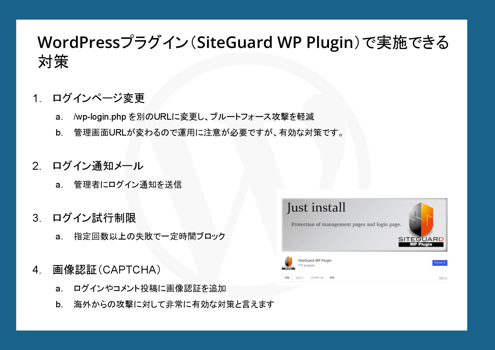 WordPressプラグイン(SiteGuard WP Plugin)で実施できる 対策 1. ログインページ変更 a. /wp-login.php を別のURLに変更し、ブルートフォース攻撃を軽減 b.