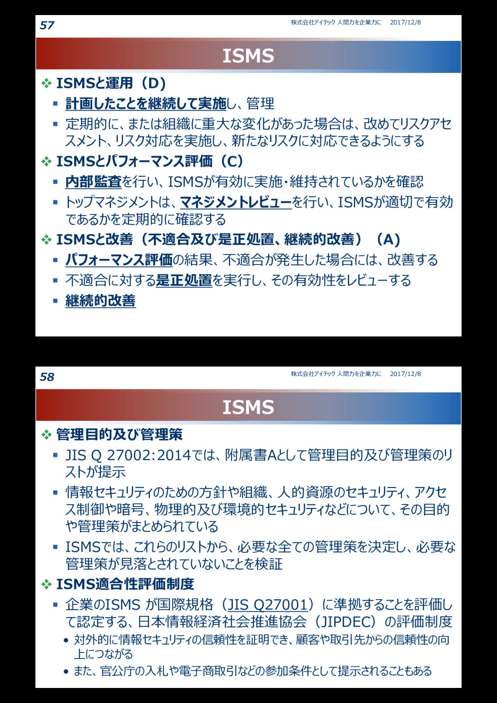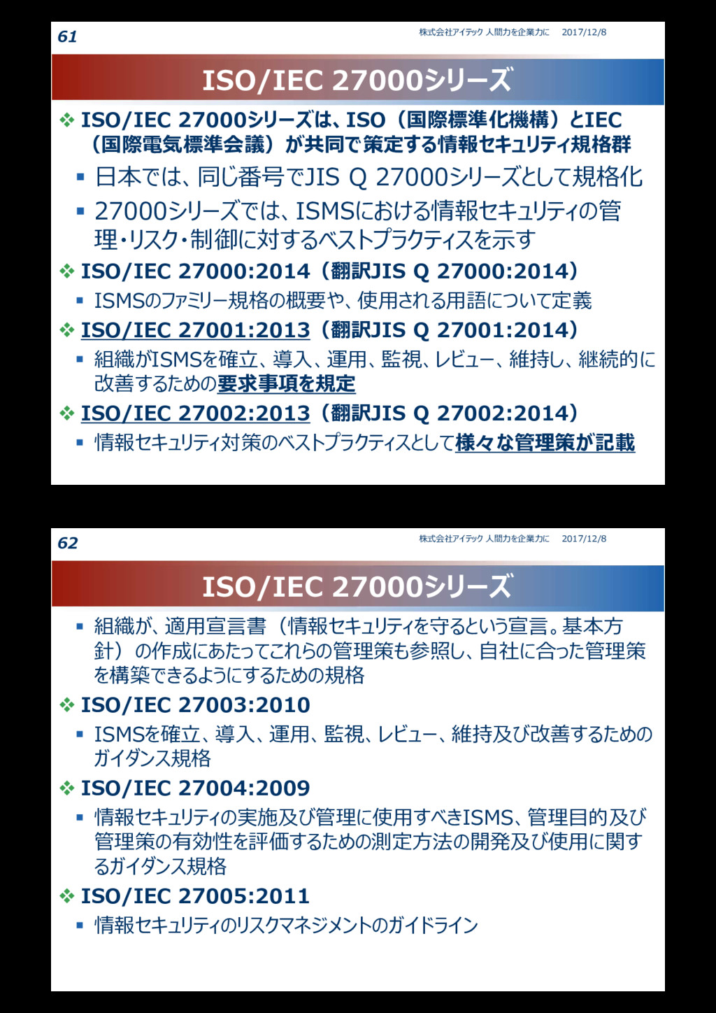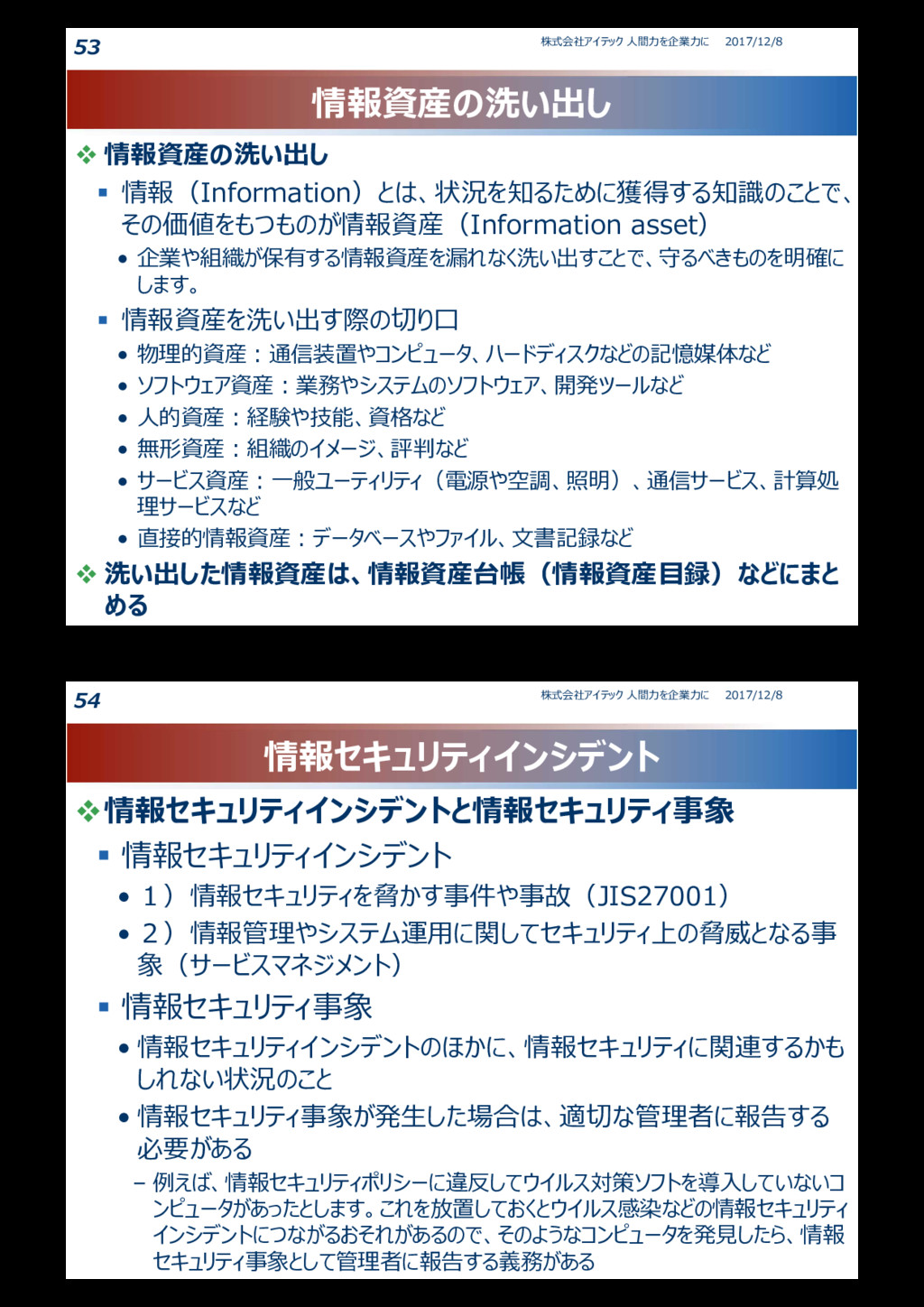 物理的資産:通信装置やコンピュータ、ハードディスクなどの記憶媒体など • ソフトウェア資産:業務やシステムのソフトウェア、開発ツールなど • 人的資産:経験や技能、資格など • 無形資産:組織のイメージ、評判など • サービス資産:一般ユーティリティ(電源や空調、照明)、通信サービス、計算処 理サービスなど • 直接的情報資産:データベースやファイル、文書記録など 洗い出した情報資産は、情報資産台帳(情報資産目録)などにまと める 2017/12/8 株式会社アイテック 人間力を企業力に 53 情報セキュリティインシデント 情報セキュリティインシデントと情報セキュリティ事象 情報セキュリティインシデント • 1)情報セキュリティを脅かす事件や事故(JIS27001) • 2)情報管理やシステム運用に関してセキュリティ上の脅威となる事 象(サービスマネジメント) 情報セキュリティ事象 • 情報セキュリティインシデントのほかに、情報セキュリティに関連するかも しれない状況のこと • 情報セキュリティ事象が発生した場合は、適切な管理者に報告する 必要がある – 例えば、情報セキュリティポリシーに違反してウイルス対策ソフトを導入していないコ ンピュータがあったとします。これを放置しておくとウイルス感染などの情報セキュリティ インシデントにつながるおそれがあるので、そのようなコンピュータを発見したら、情報 セキュリティ事象として管理者に報告する義務がある 2017/12/8 株式会社アイテック 人間力を企業力に 54