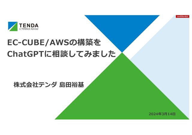 9. confidential TENDA CO., LTD. 15 ChatGPTと会話 構成相談編 島⽥ 質問のしかたを変えますね。 EC-CUBEをAWSでどのように構築すればいいでしょうか。