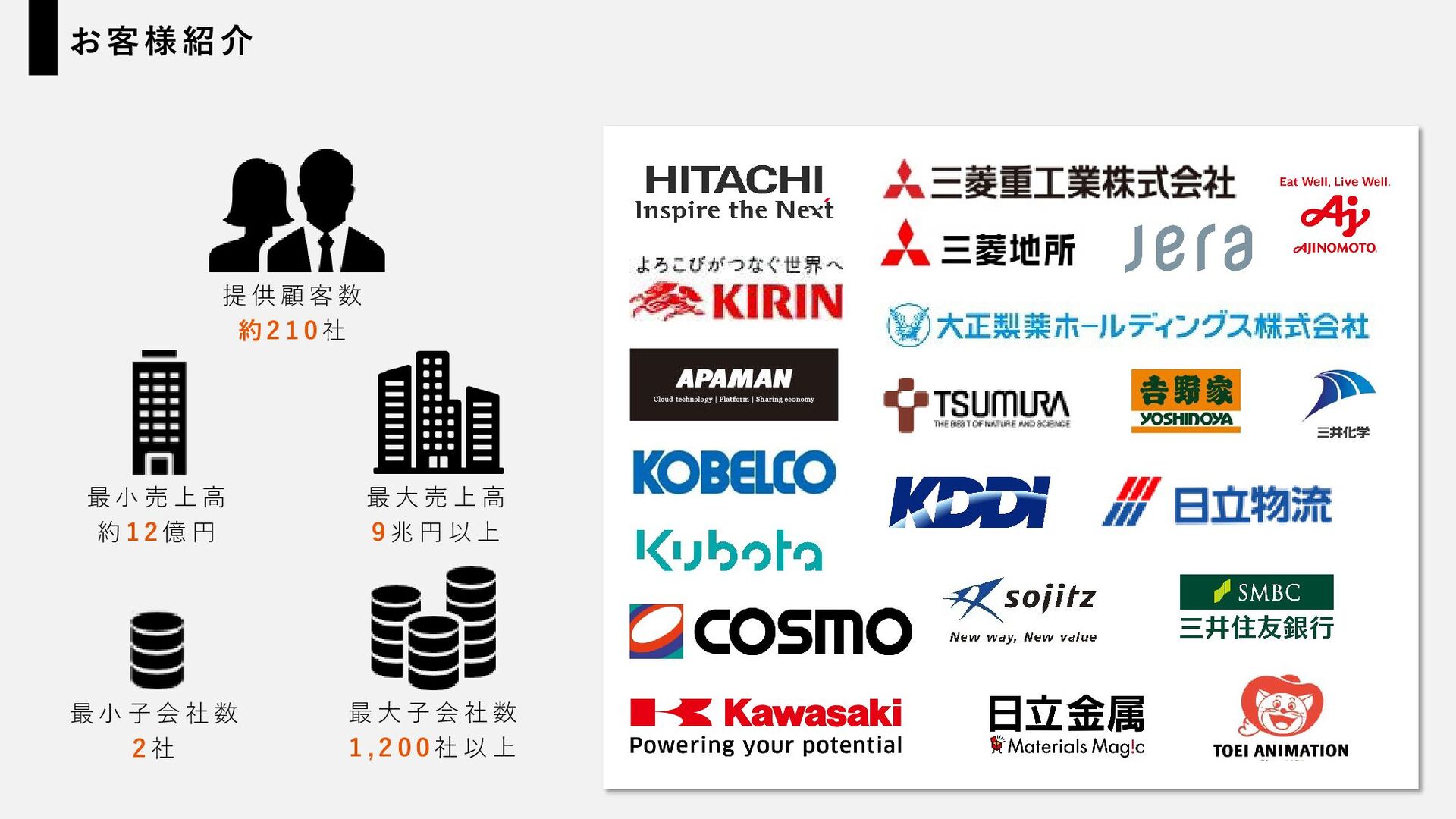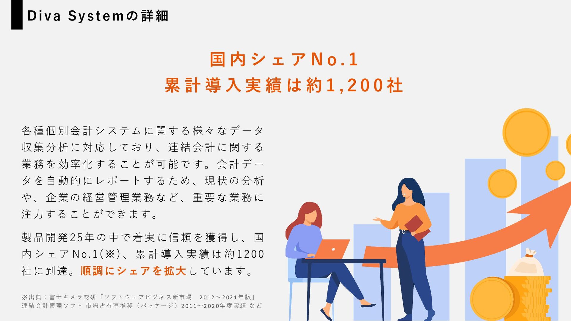 1 累 計 導 入 実 績 は 約 1 , 2 0 0 社 各種個別会計システムに関する様々なデータ 収集分析に対応しており、連結会計に関する 業務を効率化することが可能です。会計デー タを自動的にレポートするため、現状の分析 や、企業の経営管理業務など、重要な業務に 注力することができます。 製品開発25年の中で着実に信頼を獲得し、国 内 シ ェ ア No.1(※) 、 累 計 導 入 実 績 は 約 1200 社に到達。順調にシェアを拡大しています。 ※ 出 典 : 富 士 キ メラ総研「ソフトウェアビジネ ス 新市 場 2 0 1 2 ~2 0 2 1 年 版 」 連 結 会 計 管 理 ソ フ ト 市場占有率推移(パッケ ー ジ) 2 0 1 1 ~2 0 2 0 年 度 実 績 な ど
