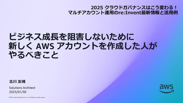 rights reserved. 32 ⽬指すべき状態 1. AWS アカウント作成時に、⾃動的に以下の状態を満たす A. ルートユーザが保護されている B. 「誰が」「いつ」「何を」したのかを追跡できる C. AWS リソースが、望ましくない設定になっていることに気付ける D. 共通の設定が漏れなく適⽤されている 2. 複数の AWS アカウントに適切な権限で簡単にログイン・利⽤できる 3. 管理アカウントを常⽤しない マルチアカウント管理をビジネス成⻑の阻害なく⾏うためには 管理アカウントもメンバーアカウントも ✅