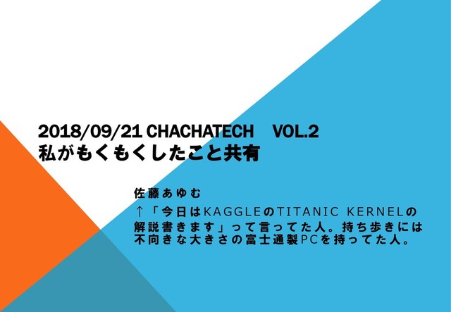 「 今 日 は K A G G L E の T I TA N I C K E R N E L の 解 説 書 き ま す 」 っ て 言 っ て た 人 。 持 ち 歩 き に は 不 向 き な 大 き さ の 富 士 通 製 P C を 持 っ て た 人 。