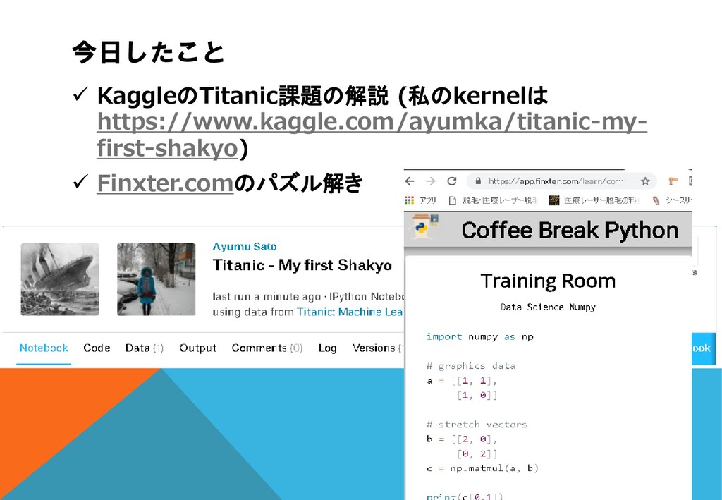 今日したこと KaggleのTitanic課題の解説 (私のkernelは https://www.kaggle.com/ayumka/titanic-my- first-shakyo) Finxter.comのパズル解き