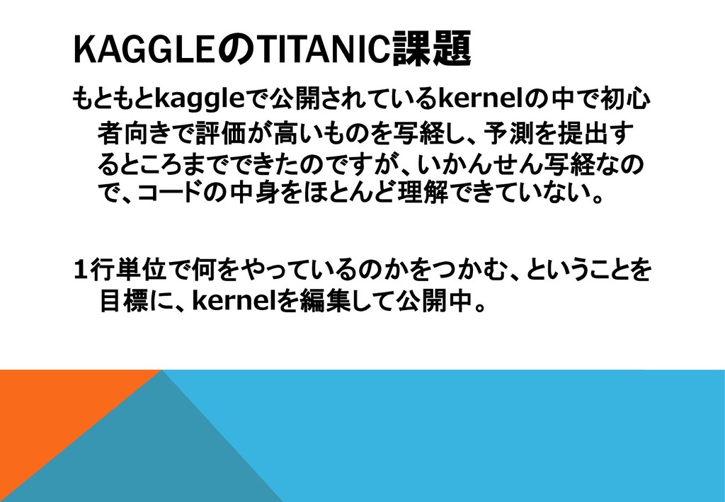 KAGGLEのTITANIC課題 もともとkaggleで公開されているkernelの中で初心 者向きで評価が高いものを写経し、予測を提出す るところまでできたのですが、いかんせん写経なの で、コードの中身をほとんど理解できていない。 1行単位で何をやっているのかをつかむ、ということを 目標に、kernelを編集して公開中。