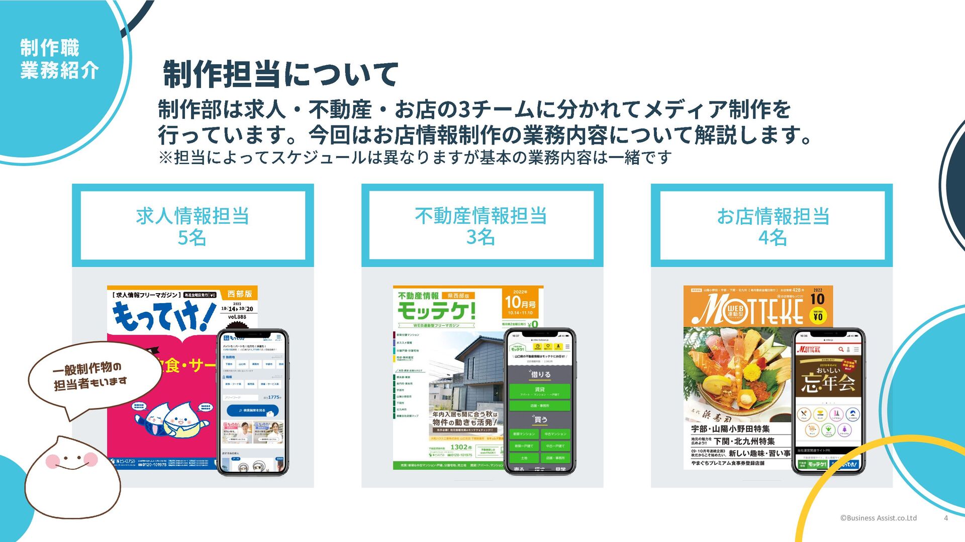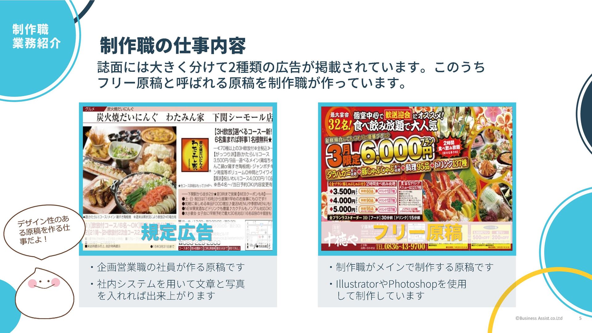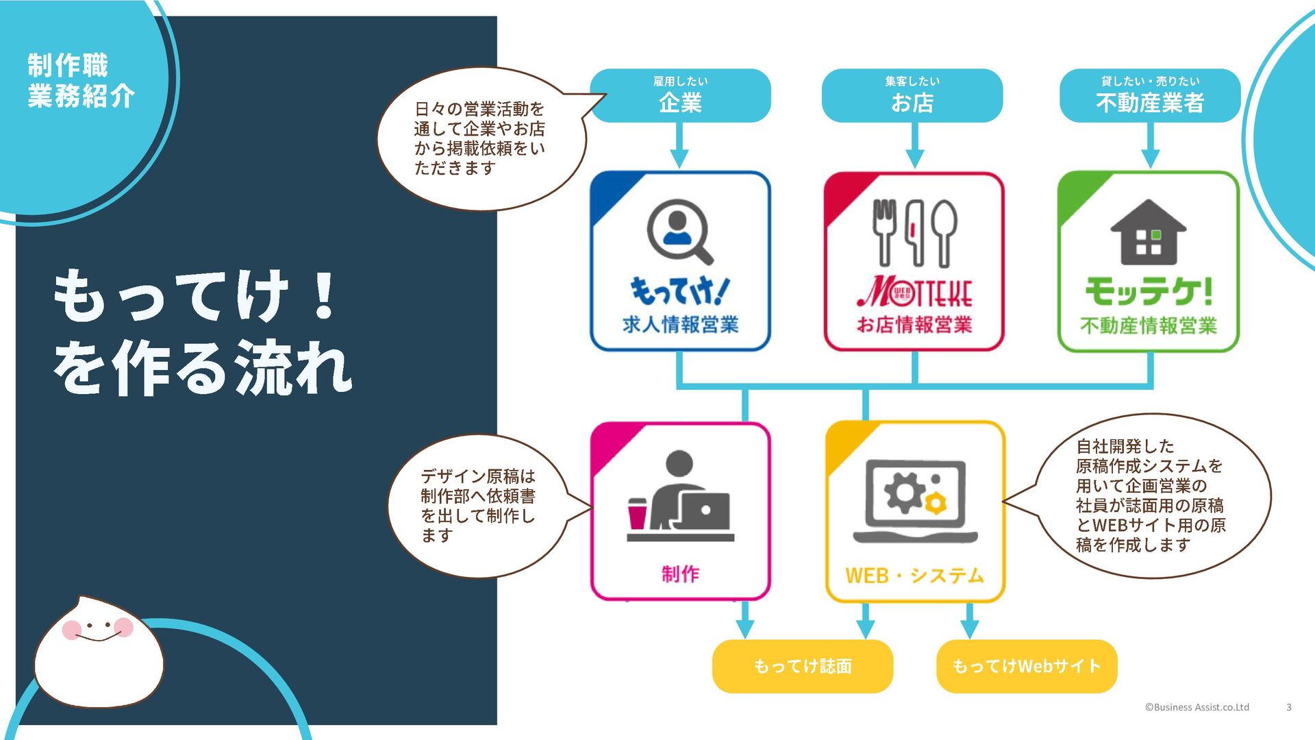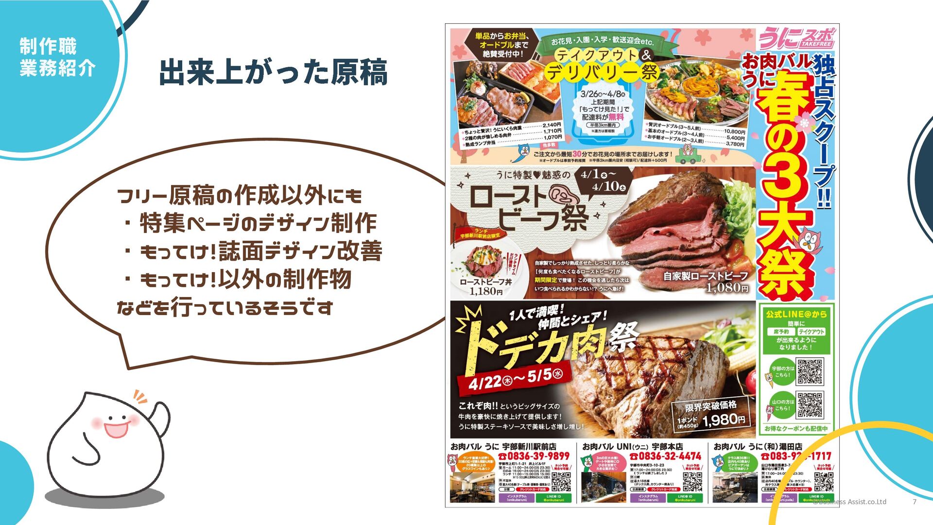 フリー原稿の作成以外にも ・特集ページのデザイン制作 ・もってけ!誌面デザイン改善 ・もってけ!以外の制作物 などを行っているそうです ©Business Assist.co.Ltd 7