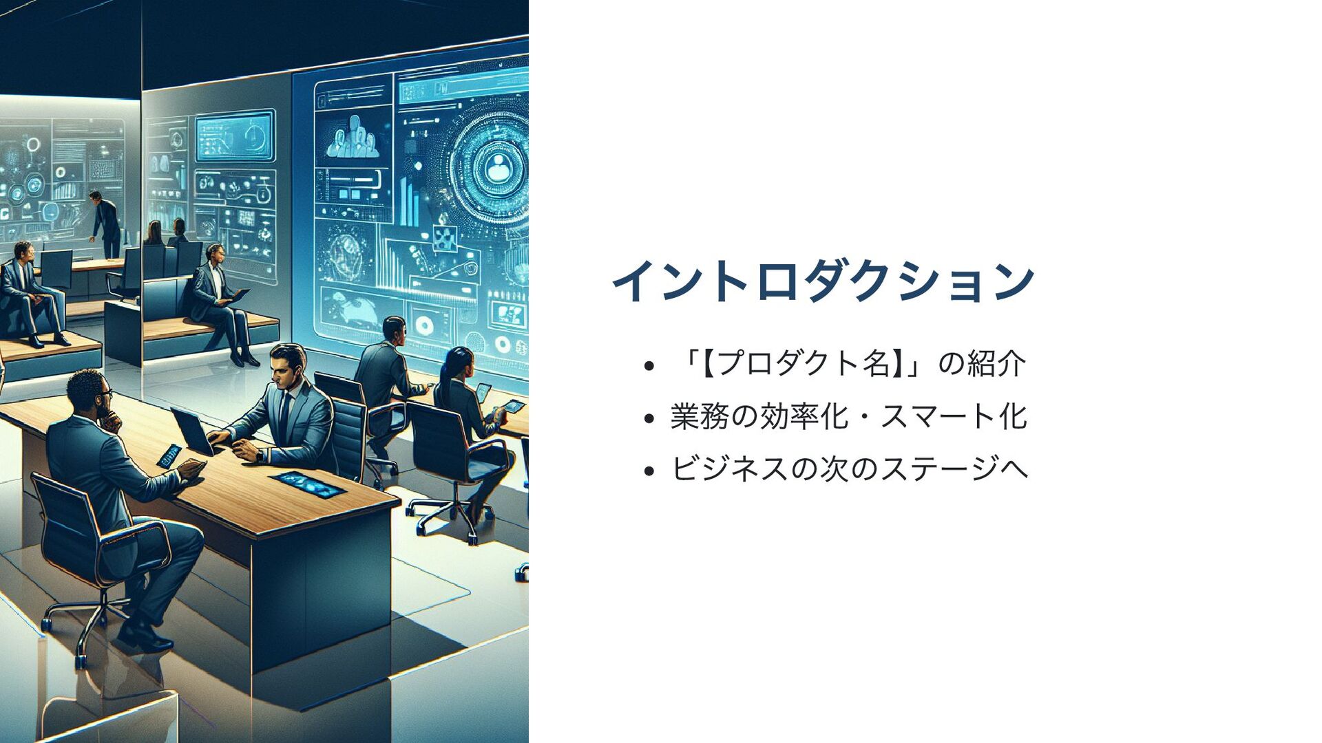 イントロダクション 「 【プロダクト名】 」の紹介 業務の効率化・スマート化 ビジネスの次のステージへ