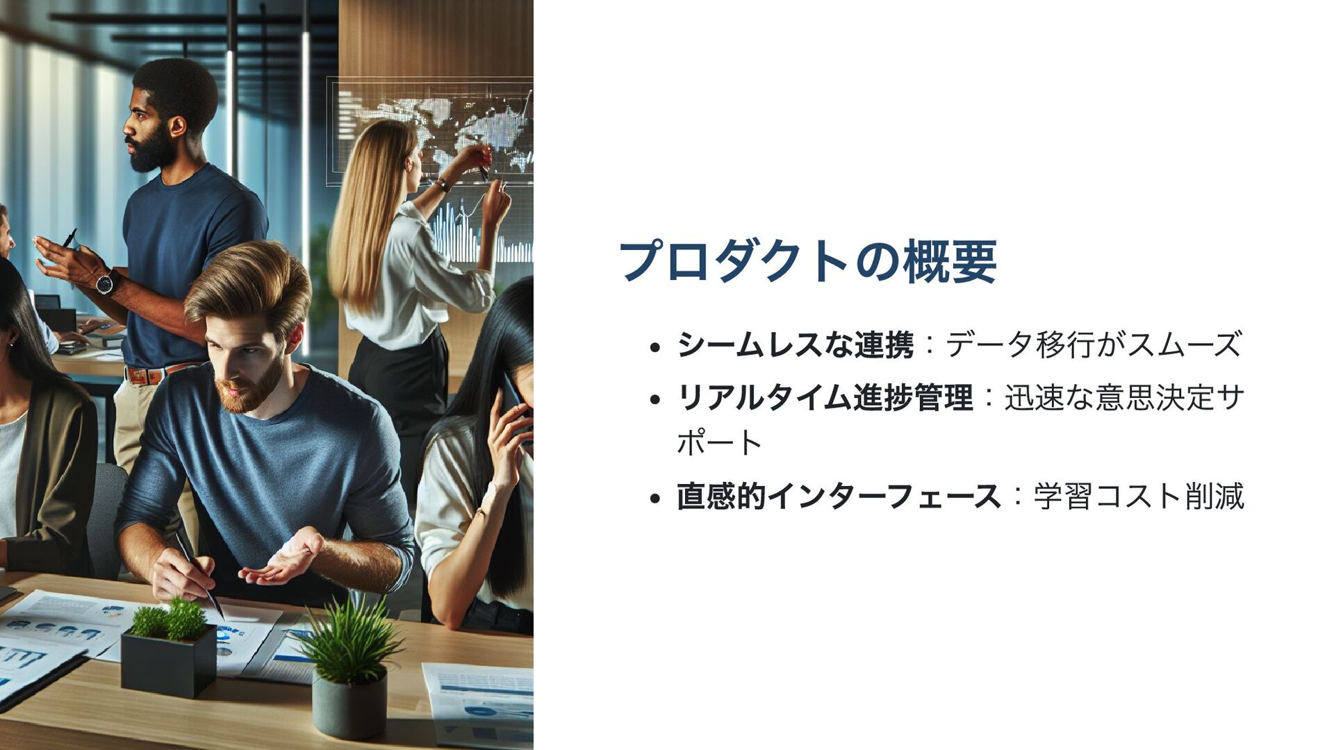 プロダクトの概要 シームレスな連携:データ移行がスムーズ リアルタイム進捗管理:迅速な意思決定サ ポート 直感的インターフェース:学習コスト削減