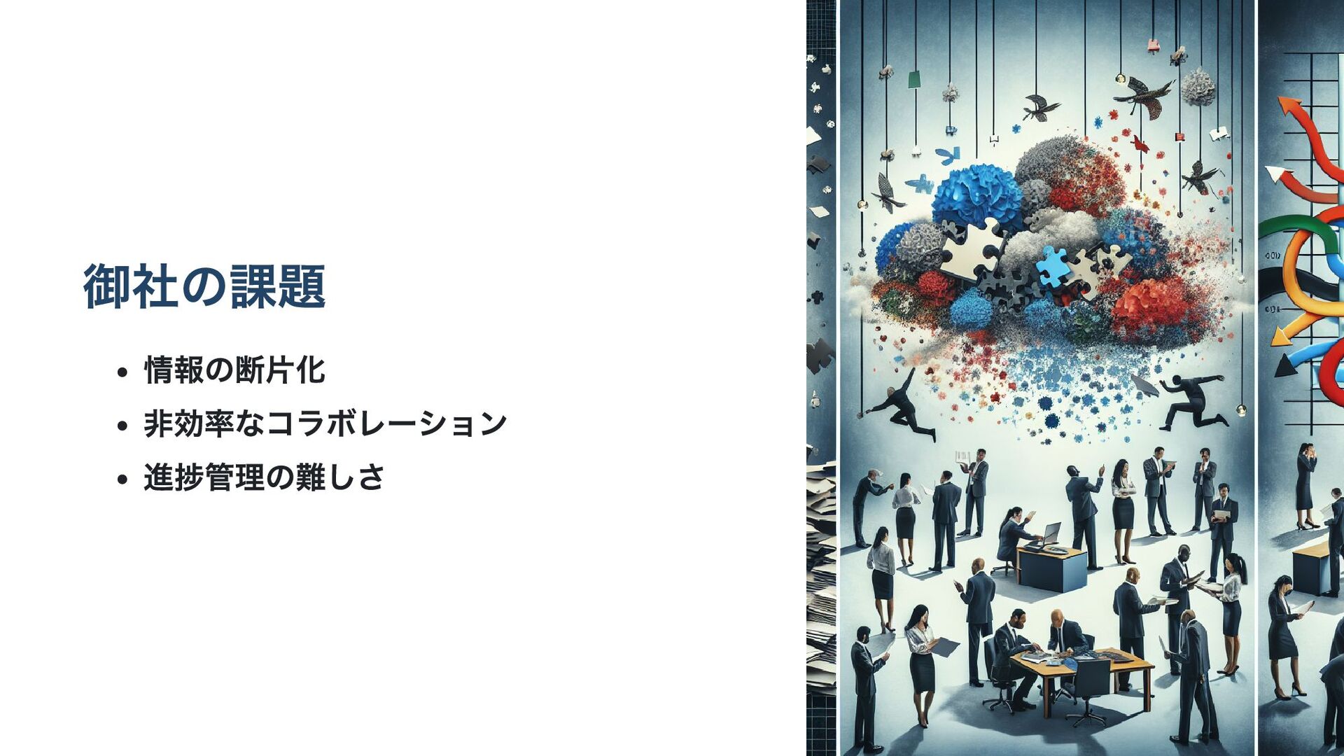 御社の課題 情報の断片化 非効率なコラボレーション 進捗管理の難しさ