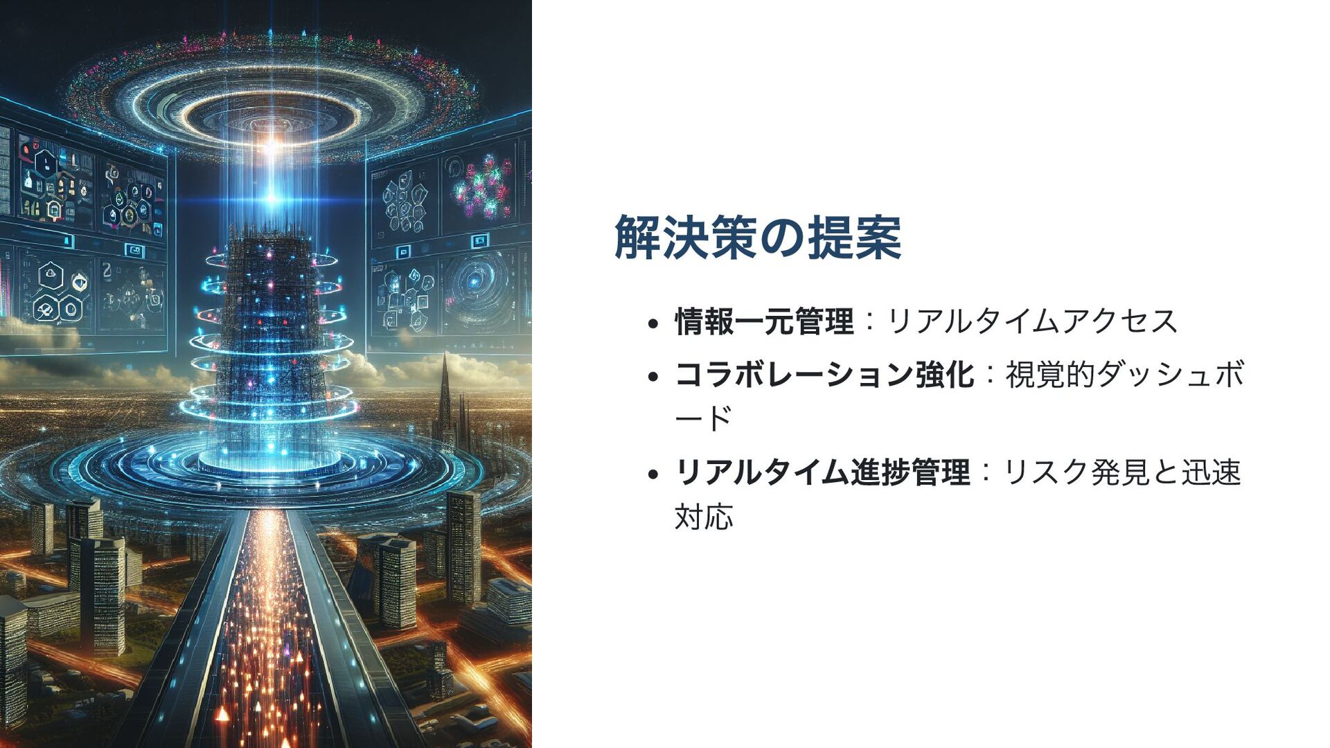 解決策の提案 情報一元管理:リアルタイムアクセス コラボレーション強化:視覚的ダッシュボ ード リアルタイム進捗管理:リスク発見と迅速 対応
