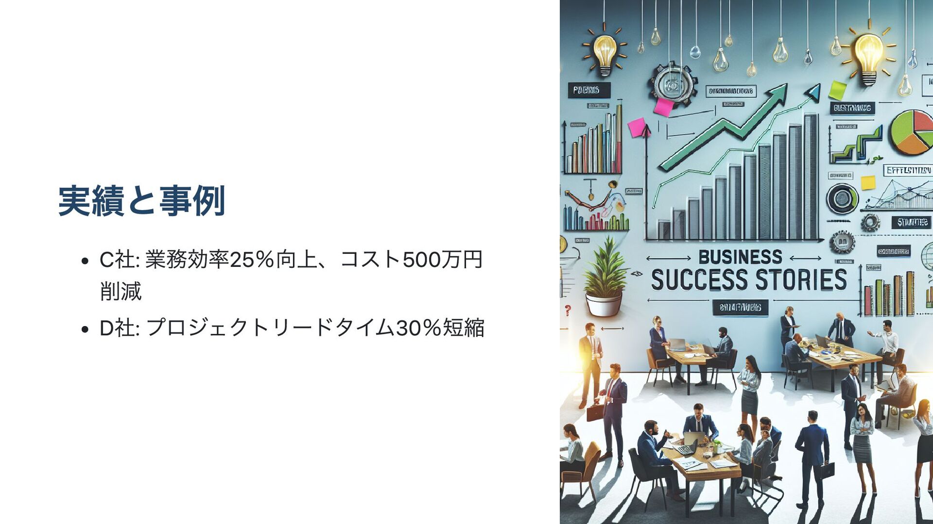 実績と事例 C社: 業務効率25%向上、コスト500万円 削減 D社: プロジェクトリードタイム30%短縮