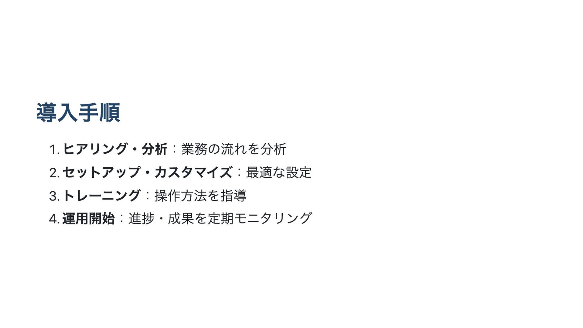 導入手順 1. ヒアリング・分析:業務の流れを分析 2. セットアップ・カスタマイズ:最適な設定 3. トレーニング:操作方法を指導 4. 運用開始:進捗・成果を定期モニタリング