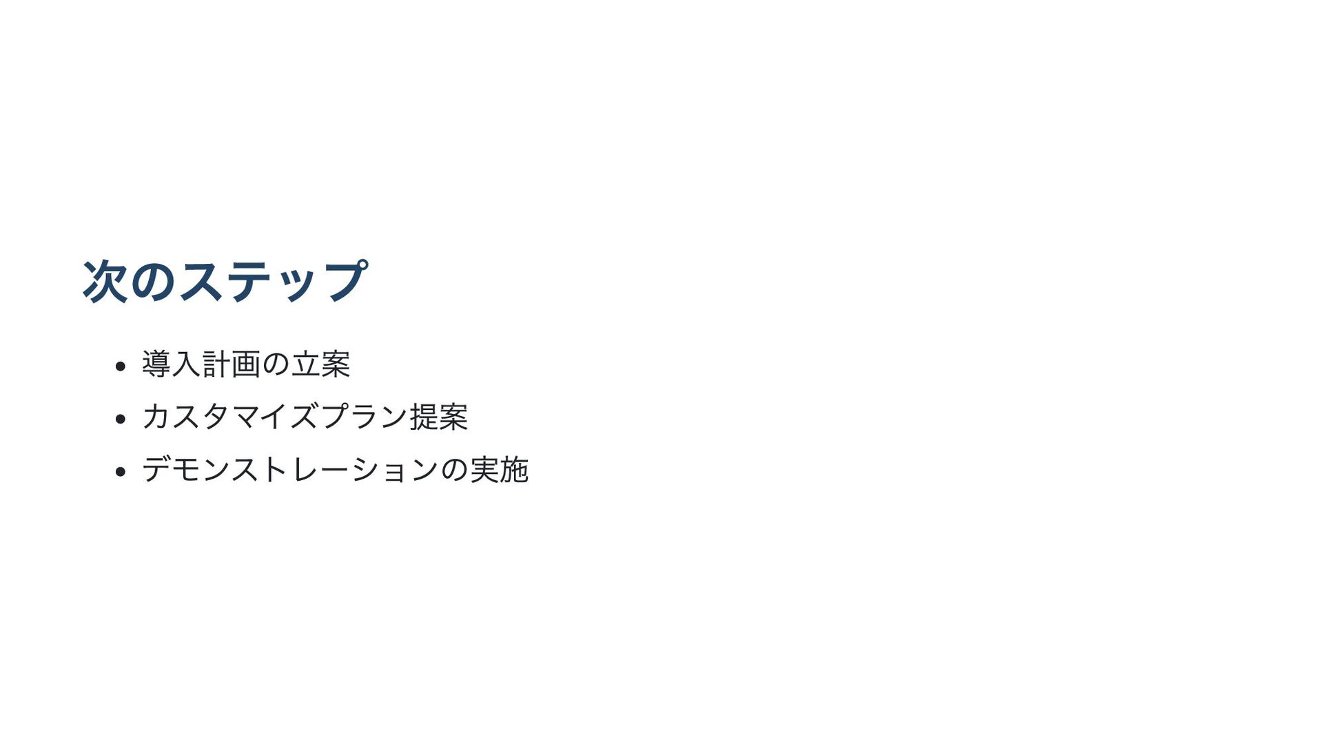 次のステップ 導入計画の立案 カスタマイズプラン提案 デモンストレーションの実施