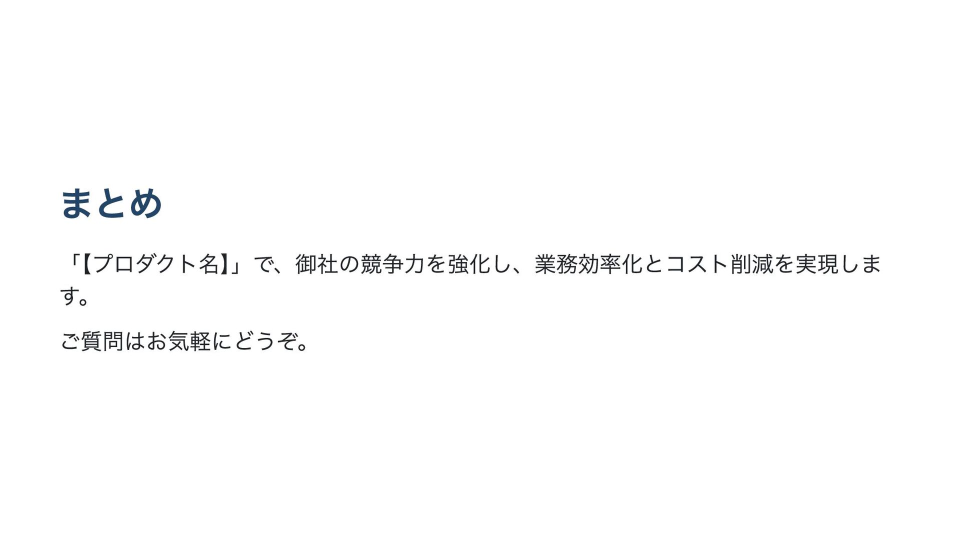 まとめ 「 【プロダクト名】 」で、御社の競争力を強化し、業務効率化とコスト削減を実現しま す。 ご質問はお気軽にどうぞ。