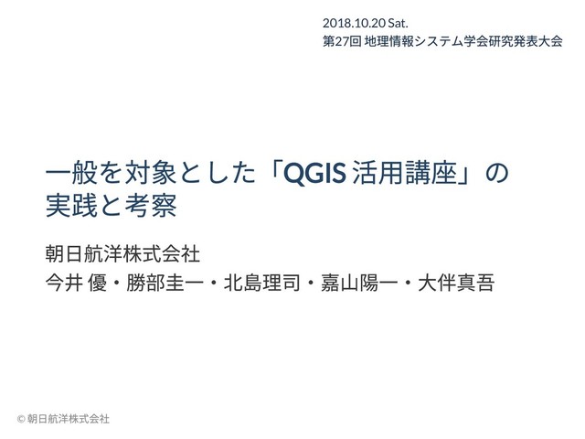 一般を対象とした「QGIS 活用講座」の 実践と考察 朝日航洋株式会社 今井 優・勝部圭一・北島理司・嘉山陽一・大伴真吾 2018.10.20 Sat. 第27 回