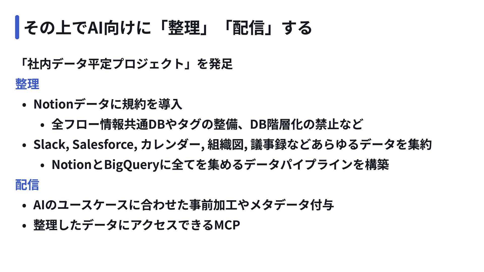 その上でAI向けに「整理」「配信」する 「社内データ平定プロジェクト」を発足 Notionデータに規約を導入 全フロー情報共通DBやタグの整備、DB階層化の禁止など Slack, Salesforce, カレンダー, 組織図, 議事録などあらゆるデータを集約 NotionとBigQueryに全てを集めるデータパイプラインを構築