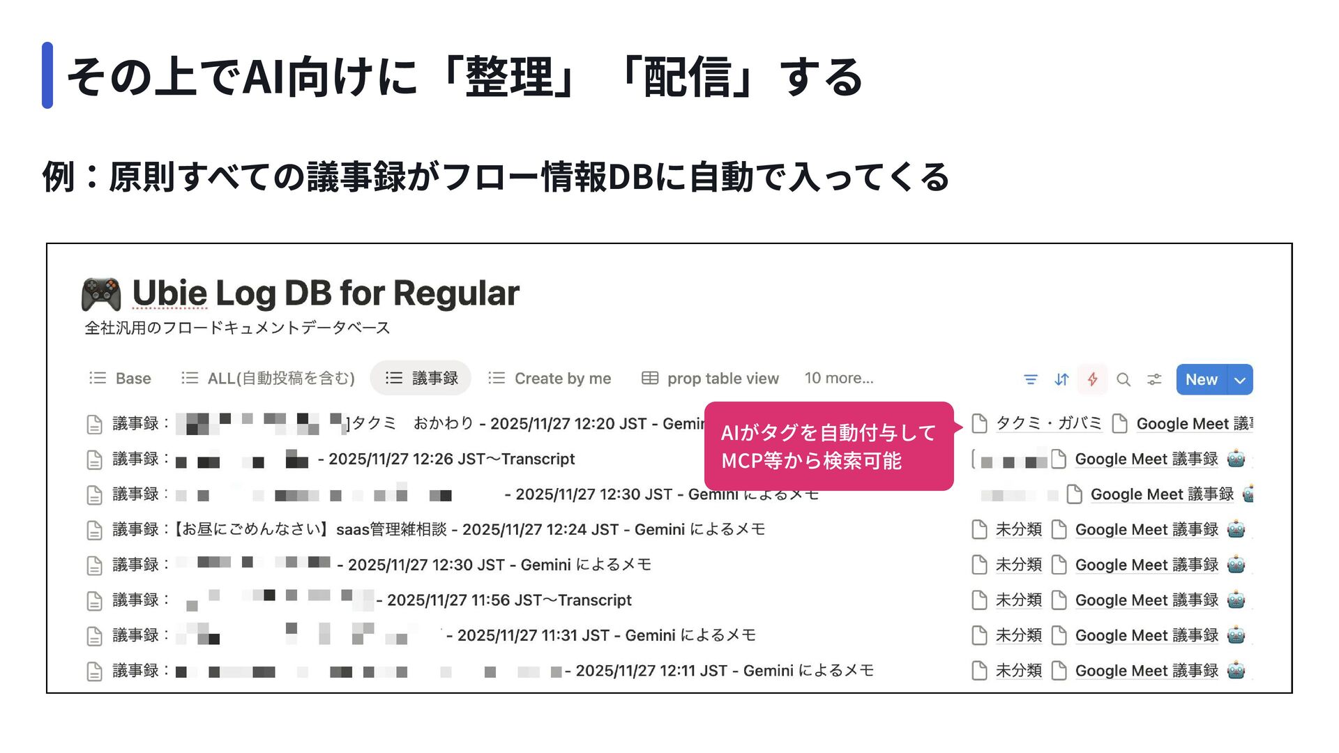 その上でAI向けに「整理」「配信」する 例:原則すべての議事録がフロー情報DBに自動で入ってくる AIがタグを自動付与して MCP等から検索可能